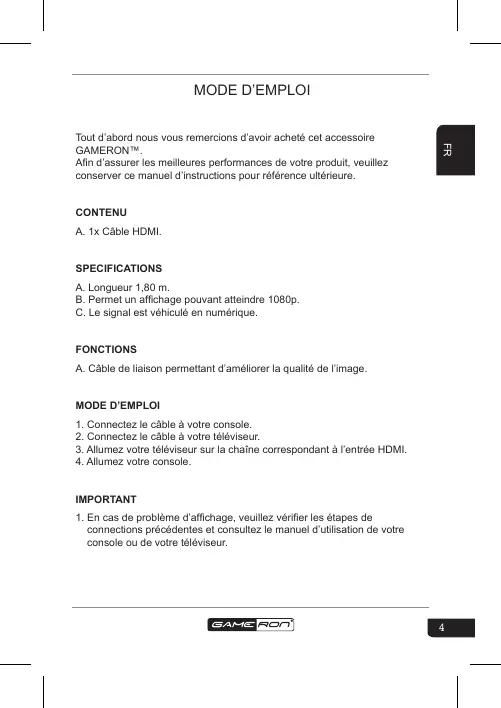 Tout d’abord nous vous remercions d’avoir acheté cet accessoire GAMERON™. Afin d’assurer les meilleures performances de votre produit, veuillez conserver ce manuel d’instructions pour référence ultérieure. CONTENU A. 1x Câble HDMI. SPECIFICATIONS A. Longueur 1,80 m. B. Permet un affichage pouvant atteindre 1080p. C. Le signal est véhiculé en numérique. FONCTIONS A. Câble de liaison permettant d’améliorer la qualité de l’image.