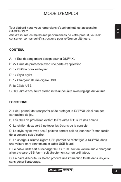 Tout d’abord nous vous remercions d’avoir acheté cet accessoire GAMERON™. Afin d’assurer les meilleures performances de votre produit, veuillez conserver ce manuel d’instructions pour référence ultérieure. CONTENU A. 1x Etui de rangement design pour la DSi™ XL B. 2x Films de protection avec une carte d’application C. 1x Chiffon doux nettoyant D. 1x Stylo-stylet E. 1x Chargeur allume-cigare USB F. 1x Câble USB G. 1x Paire d’écouteurs stéréo intra-auriculaire avec réglage du volume FONCTIONS A. L’étui permet de transporter et de protéger la DSi™XL ainsi que des cartouches de jeu. B. Les films de protection évitent les rayures et l’usure des écrans. C. La chiffon doux sert à nettoyer les écrans de la console. D. Le stylo-stylet avec ses 2 pointes permet soit de jouer sur l’écran tactile de la console soit d’écrire. E. Le chargeur allume-cigare USB permet de recharger la DSi™XL dans une voiture en y connectant le câble USB fourni. F. Le câble USB sert à recharger la DSi™ XL soit en voiture sur le chargeur allume-cigare USB fourni soit directement sur un ordinateur. G. La paire d’écouteurs stéréo procure une immersion totale dans les jeux sans gêner l’entourage.