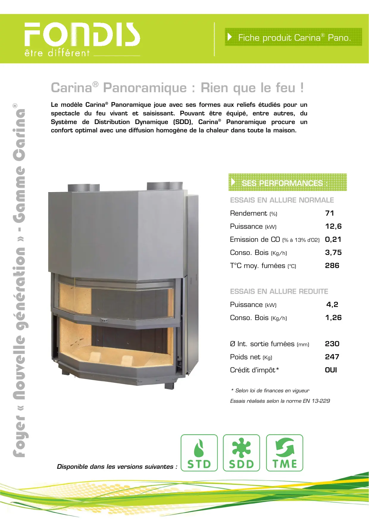 - Selon loi de finances en vigueur Essais réalisés selon la norme EN 13-229 Disponible dans les versions suivantes : Document non contractuel : dans une volonté constante d’amélioration de nos produits, nous nous réservons le droit d’effectuer des modifications sans préavis - Copyright Fondis 01/20101- Tous droits réservés - L’énergie est notre avenir, économisons la. Carina® panoramique : caractéristiques Foyer en acier avec carénage Sole et côtés en réfractaire pressé Isolation du réfractaire Chenets intégrés au réfractaire Plaque de fonte intérieure à l’arrière du foyer Porte escamotable par le haut (facilité d’utilisation) Porte à ouverture latérale pour l’entretien Dispositif de plaquage de la porte à la fermeture