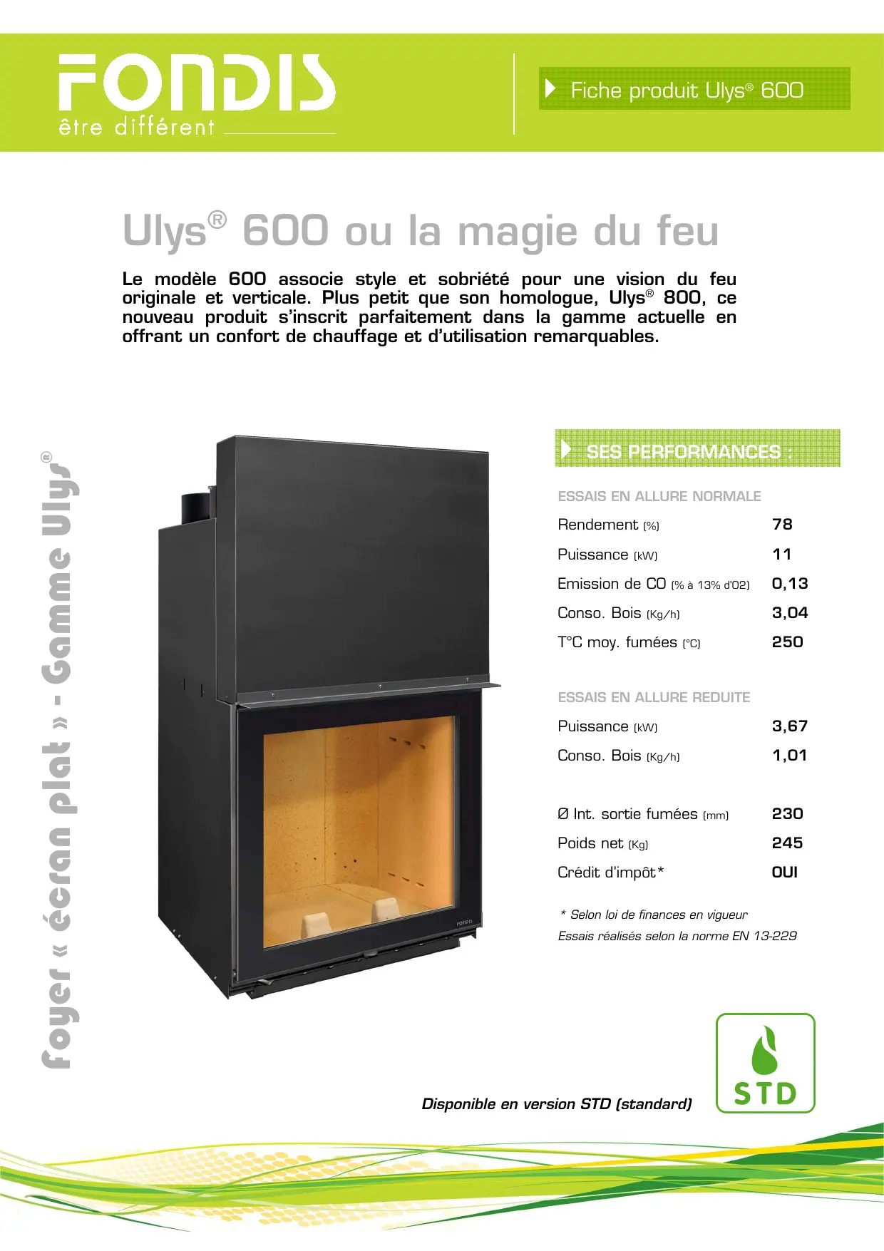 - Selon loi de finances en vigueur Essais réalisés selon la norme EN 13-229 Disponible en version STD (standard) Ulys® 600 : caractéristiques