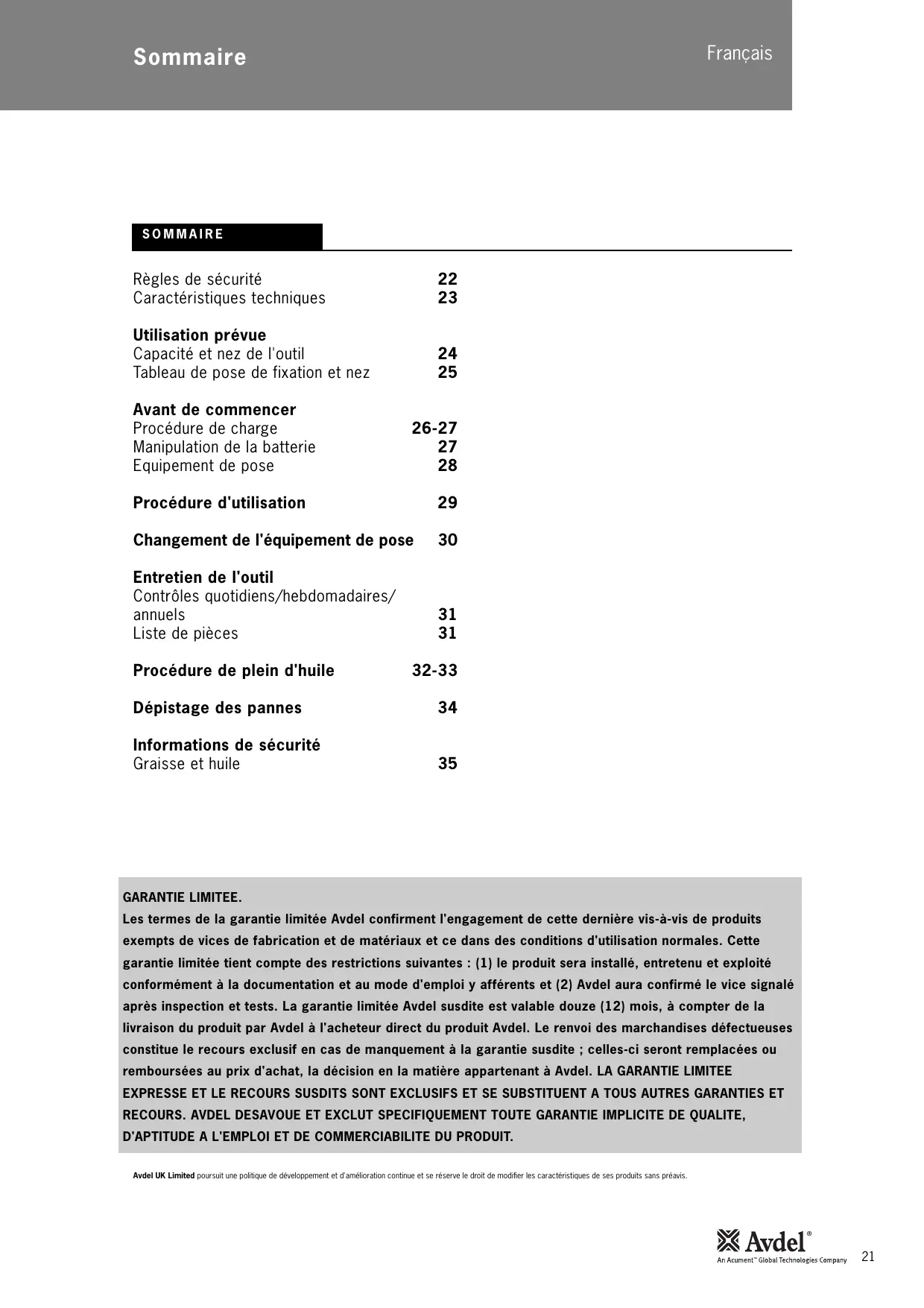 GARANTIE LIMITEE. Les termes de la garantie limitée Avdel confirment l'engagement de cette dernière vis-à-vis de produits exempts de vices de fabrication et de matériaux et ce dans des conditions d'utilisation normales. Cette garantie limitée tient compte des restrictions suivantes : (1) le produit sera installé, entretenu et exploité conformément à la documentation et au mode d'emploi y afférents et (2) Avdel aura confirmé le vice signalé après inspection et tests. La garantie limitée Avdel susdite est valable douze (12) mois, à compter de la livraison du produit par Avdel à l'acheteur direct du produit Avdel. Le renvoi des marchandises défectueuses constitue le recours exclusif en cas de manquement à la garantie susdite ; celles-ci seront remplacées ou remboursées au prix d'achat, la décision en la matière appartenant à Avdel. LA GARANTIE LIMITEE EXPRESSE ET LE RECOURS SUSDITS SONT EXCLUSIFS ET SE SUBSTITUENT A TOUS AUTRES GARANTIES ET RECOURS. AVDEL DESAVOUE ET EXCLUT SPECIFIQUEMENT TOUTE GARANTIE IMPLICITE DE QUALITE, D'APTITUDE A L'EMPLOI ET DE COMMERCIABILITE DU PRODUIT. Avdel UK Limited poursuit une politique de développement et d'amélioration continue et se réserve le droit de modifier les caractéristiques de ses produits sans préavis.