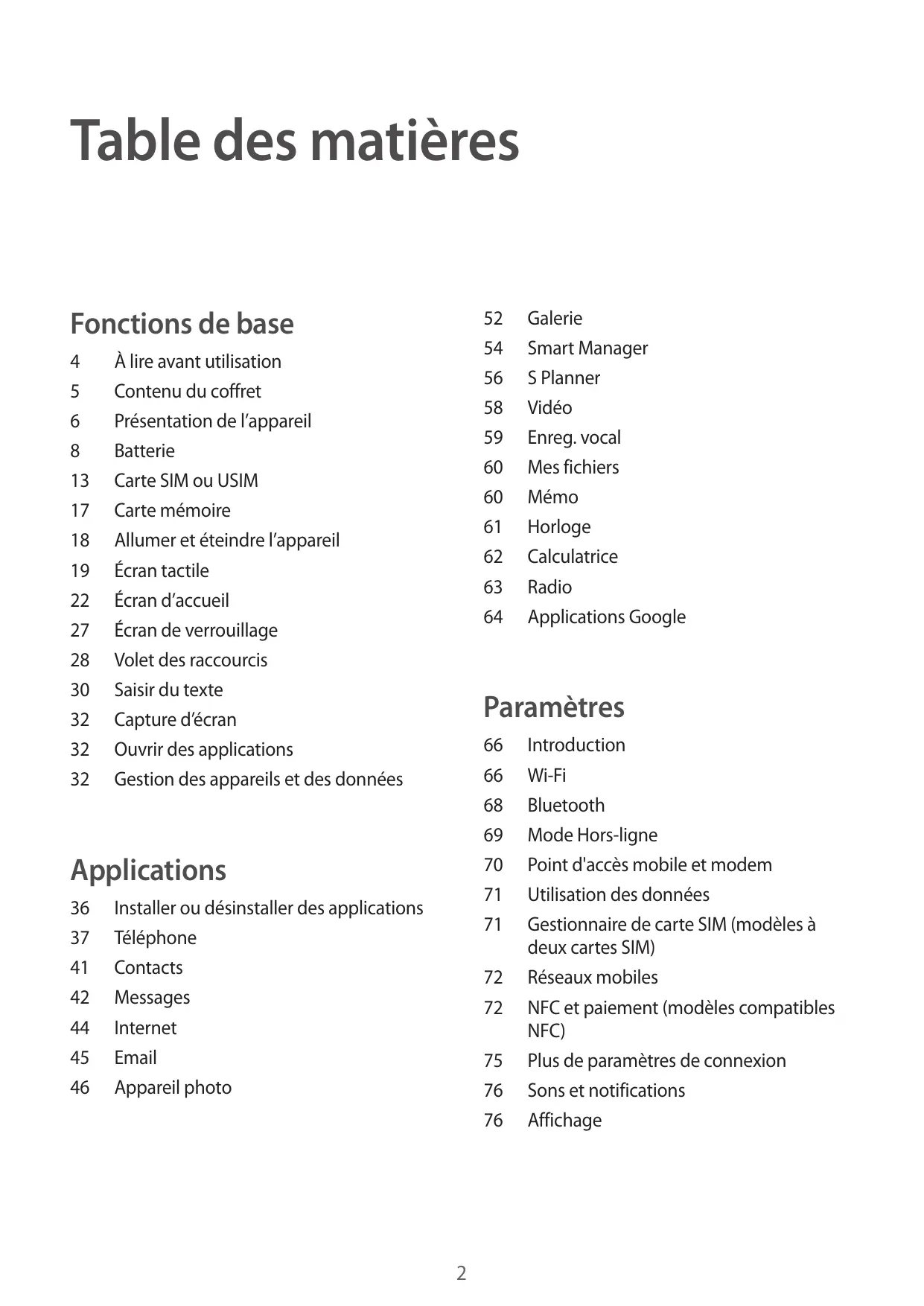 À lire avant utilisation Contenu du coffret Présentation de l’appareil Batterie Carte SIM ou USIM Carte mémoire Allumer et éteindre l’appareil Écran tactile Écran d’accueil Écran de verrouillage Volet des raccourcis Saisir du texte Capture d’écran Ouvrir des applications Gestion des appareils et des données Paramètres