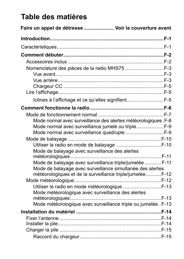 WARRANTY: If, after following the instructions in this Operating Guide you are certain that the Product is defective, pack the Product carefully (preferably in its original packaging). Include evidence of original purchase and a note describing the defect that has caused you to return it. The Product should be shipped freight prepaid, by traceable means, or delivered, to warrantor at: Uniden America Corporation Parts and Service Division 4700 Amon Carter Boulevard Fort Worth, TX, 76155 (800) 554-3988 E-30 Uniden MHS75 Radio Owner’s Manual Table des matières Faire un appel de détresse....................... Voir la couverture avant Introduction....................................................................................F-1 Caractéristiques..............................................................................F-1 Comment débuter..........................................................................F-2 Accessoires inclus.......................................................................F-2 Nomenclature des pièces de la radio MHS75.............................F-3 Vue avant...............................................................................F-3 Vue arrière..............................................................................F-3 Chargeur CC..........................................................................F-5 Lire l’affichage.............................................................................F-5 Icônes à l’affichage et ce qu’elles signifient............................F-5 Comment fonctionne la radio.......................................................F-6 Mode de fonctionnement normal.................................................F-7 Mode normal avec surveillance des alertes météorologiques..F-8 Mode normal avec surveillance jumelé ou triple.....................F-9 Mode normal avec surveillance quadruple.............................F-9 Mode de balayage.....................................................................F-10 Utiliser la radio en mode de balayage .................................F-10 Mode de balayage avec surveillance des alertes météorologiques................................................................... F-11 Mode de balayage avec surveillance triple/jumelée............. F-11 Mode de balayage avec surveillance simultanée des alertes météorologiques et de la surveillance triple/jumelée............F-12 Mode météorologique................................................................F-12 Utiliser la radio en mode météorologique.............................F-13 Mode météorologique avec surveillance des alertes météorologiques...................................................................F-13 Mode météorologique avec surveillance triple ou jumelée...F-13 Installation du matériel...............................................................F-14 Fixer l’antenne...........................................................................F-14 Installer la pile............................................................................F-14 Charger la pile...........................................................................F-15 Raccord du chargeur............................................................F-15 Remarques importantes relatives à la charge de la pile.......F-15 Débrancher le chargeur........................................................F-16 Fixer l’attache-ceinture..............................................................F-16 Utiliser votre radio.......................................................................F-17 Régler le volume........................................................................F-17 Régler le niveau de suppression du bruit de fond.....................F-17 Changer le canal.......................................................................F-18 Effectuer une transmission........................................................F-18 Amplifier la puissance de transmission................................F-18 Régler le mode des canaux UIC (US/CAN/INT)........................F-19 Entretien et dépannage...............................................................F-19 Questions fréquentes................................................................F-20 Spécifications..............................................................................F-21 Canaux et fréquences...............................................................F-22 Fréquences des canaux des États-Unis et étiquettes des canaux...............................................................................F-22 Fréquence des canaux canadiens et étiquettes des canaux.. F-24 Fréquence des canaux internationaux et étiquettes des canaux...............................................................................F-26 Fréquences des canaux météorologiques et étiquettes des canaux........................................................................F-28 Réglementations et avertissements relatifs à la sécurité.......F-29 Fonctionnement des services de la radio maritime...................F-29 Directives de base de la radio...................................................F-29 Renseignements de la FCC et d’Industrie Canada...................F-30 Renseignements de la FCC sur l’exposition aux fréquences radio .......................................................................................F-31 Avertissement relatif au bloc-piles au lithium-ion.......................F-32 Garantie limitée de trois ans......................................................F-33 Introduction Caractéristiques La radio MHS75 procure les fonctions principales suivantes :