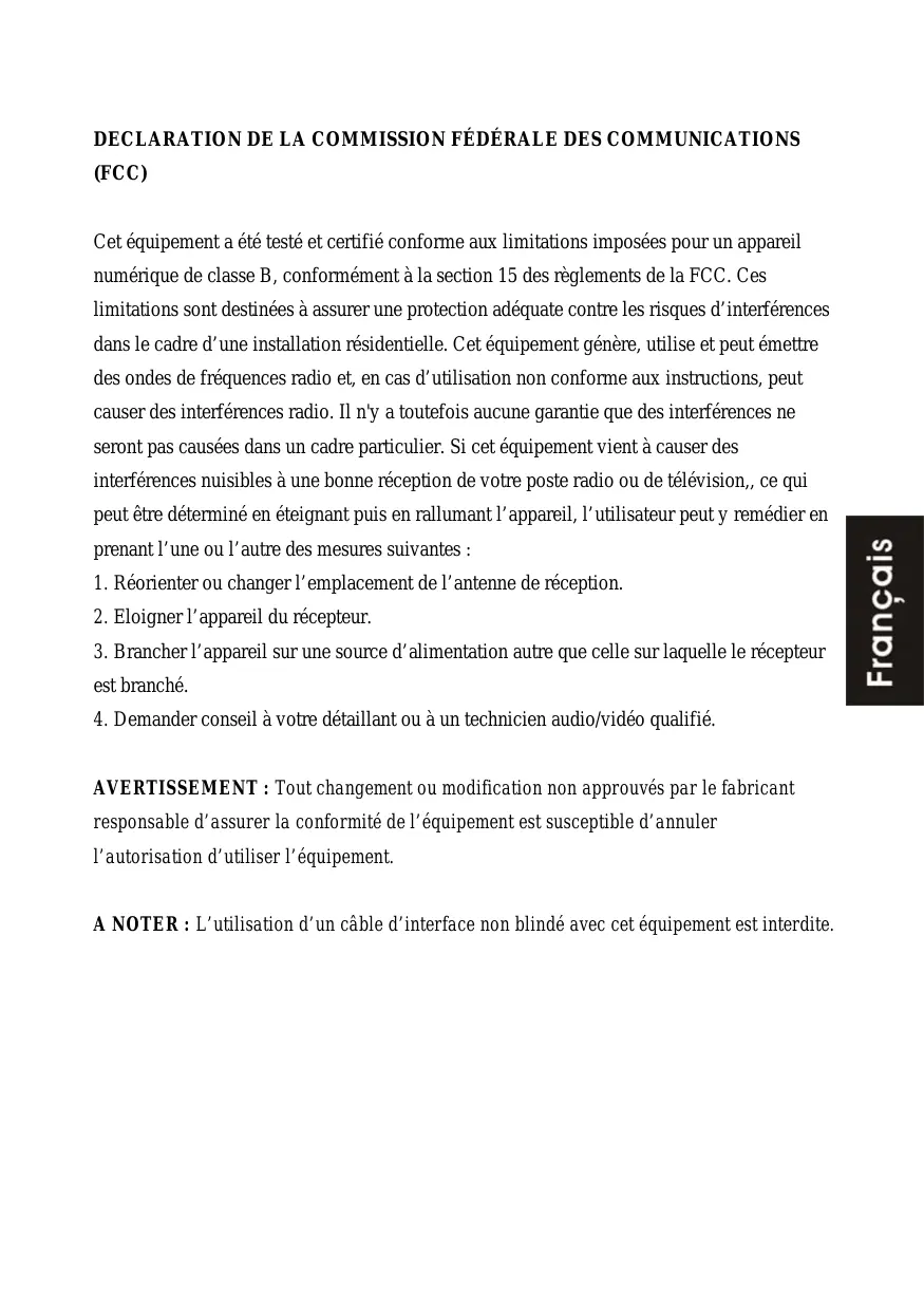 Cet équipement a été testé et certifié conforme aux limitations imposées pour un apparéil numérique de classe B, conformément à la section 15 des règlements de la FCC. Ces limitations sont destinées à assurer une protection ajustée contre les risques d'interférences dans le cadre d'une installation résidentielle. Cet équipement générale, utilise et peut émettre des ondes de fréquences radio et, en cas d'utilisation non conforme aux instructions, peut causer des interférences radio. Il n'y a toutefois aucune garantie que des interférences ne seront pas causées dans un cadre particulier. Si cet équipement vient à causer des interférences nuisibles à une bonne réception de votre poste radio ou de télévision,, ce qui peut être déterminé en éteignant puis en rallumant l' apparéil, l'utiliseur peut y remédier en prénant l'une ou l'autre des mesures suivantes :