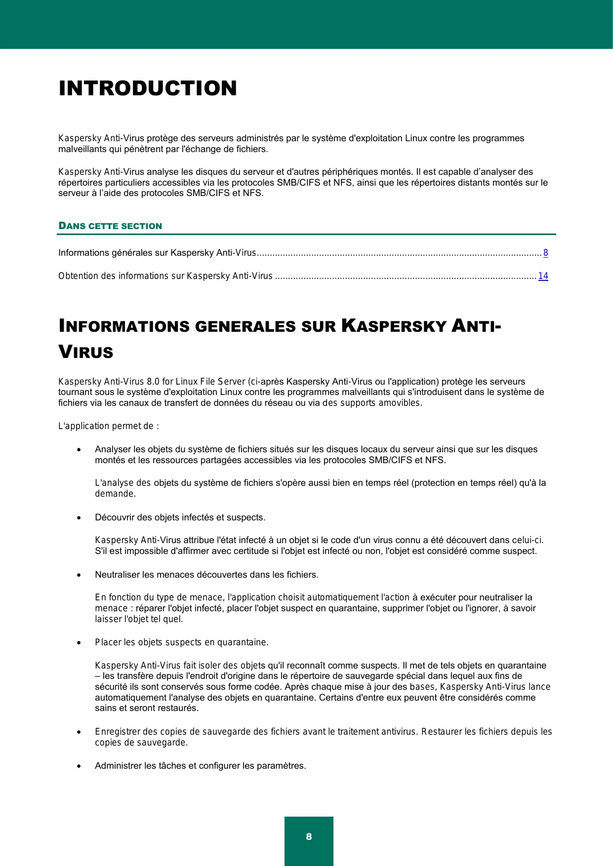 INTRODUCTION Kaspersky Anti-Virus protège des serveurs administrés par le système d'exploitation Linux contre les programmes malveillants qui pénètrent par l'échange de fichiers. Kaspersky Anti-Virus analyse les disques du serveur et d'autres périphériques montés. Il est capable d’analyser des répertoires particuliers accessibles via les protocoles SMB/CIFS et NFS, ainsi que les répertoires distants montés sur le serveur à l’aide des protocoles SMB/CIFS et NFS.