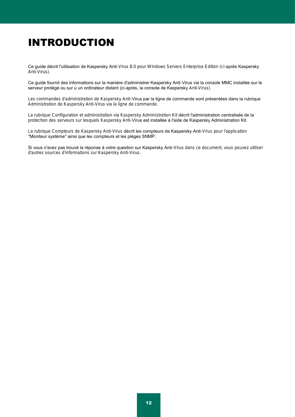 Présentation des compteurs et pièges SNMP de Kaspersky Anti-Virus ........................................................................ 418 Compteurs SNMP de Kaspersky Anti-Virus .................................................................................................................. 419 Pièges SNMP ................................................................................................................................................................ 421 PRESENTATION DES COMPTEURS ET PIEGES SNMP DE KASPERSKY ANTI-VIRUS Si vous avez inclus le composant Compteurs et pièges SNMP dans les composants de Kaspersky Anti-Virus à installer, vous pouvez consulter les compteurs et les pièges de Kaspersky Anti-Virus selon les protocoles Simple Network Management Protocol (SNMP) et HP Open View. Pour consulter les compteurs et les pièges de Kaspersky Anti-Virus depuis l'ordinateur-poste de travail de l'administrateur, lancez sur le serveur protégé le service SNMP (SNMP Service) et le service de pièges SNMP (SNMP Trap Service) ainsi que le service SNMP (SNMP Service) sur le poste de travail de l'administrateur.