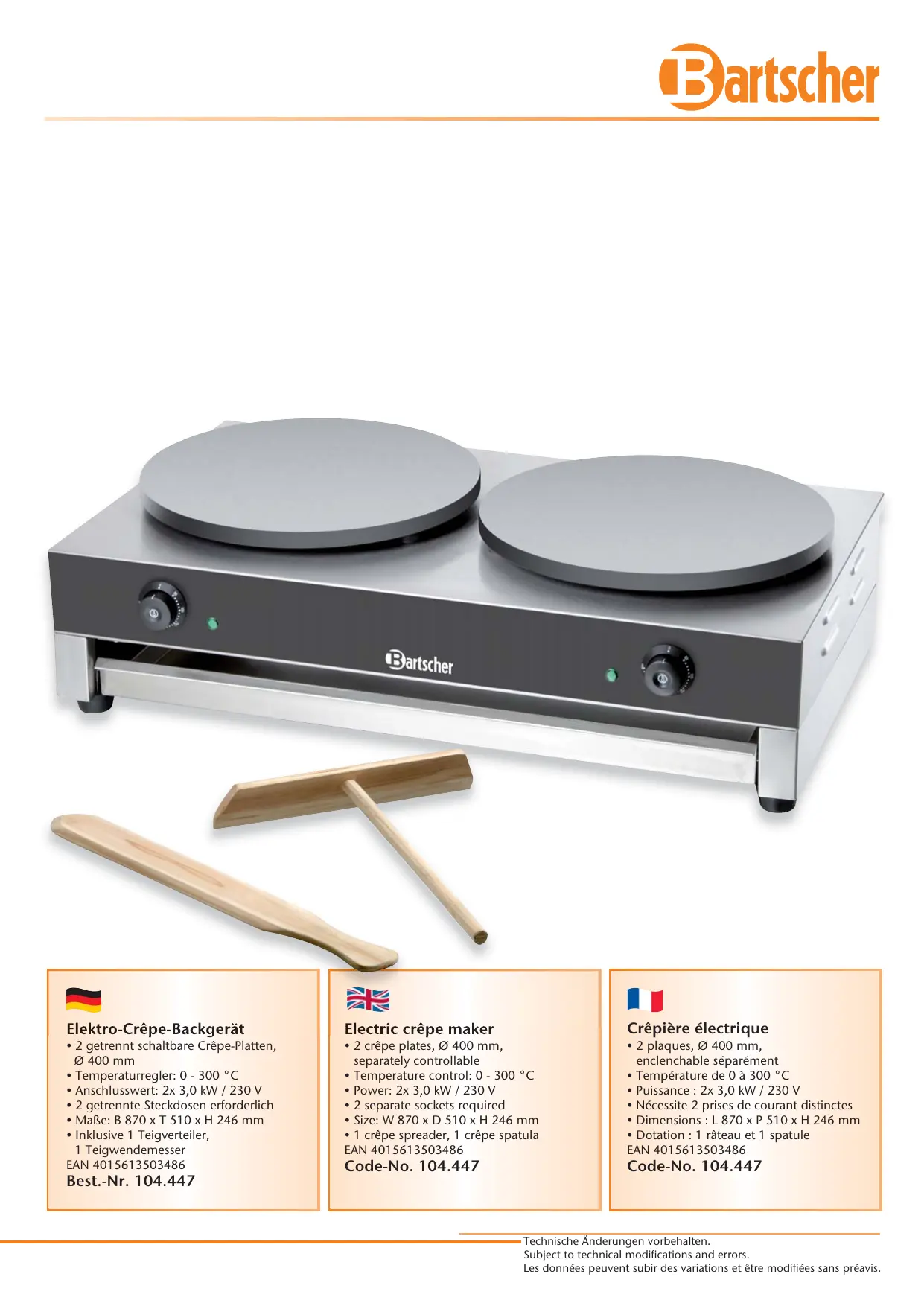 Téléchargez la notice de votre Crépière au format PDF gratuitement ! Retrouvez votre notice 104447-027 - BARTSCHER et reprennez votre appareil électronique en main. Sur cette page sont publiés tous les documents nécessaires à l'utilisation de votre appareil 104447-027 de la marque BARTSCHER.