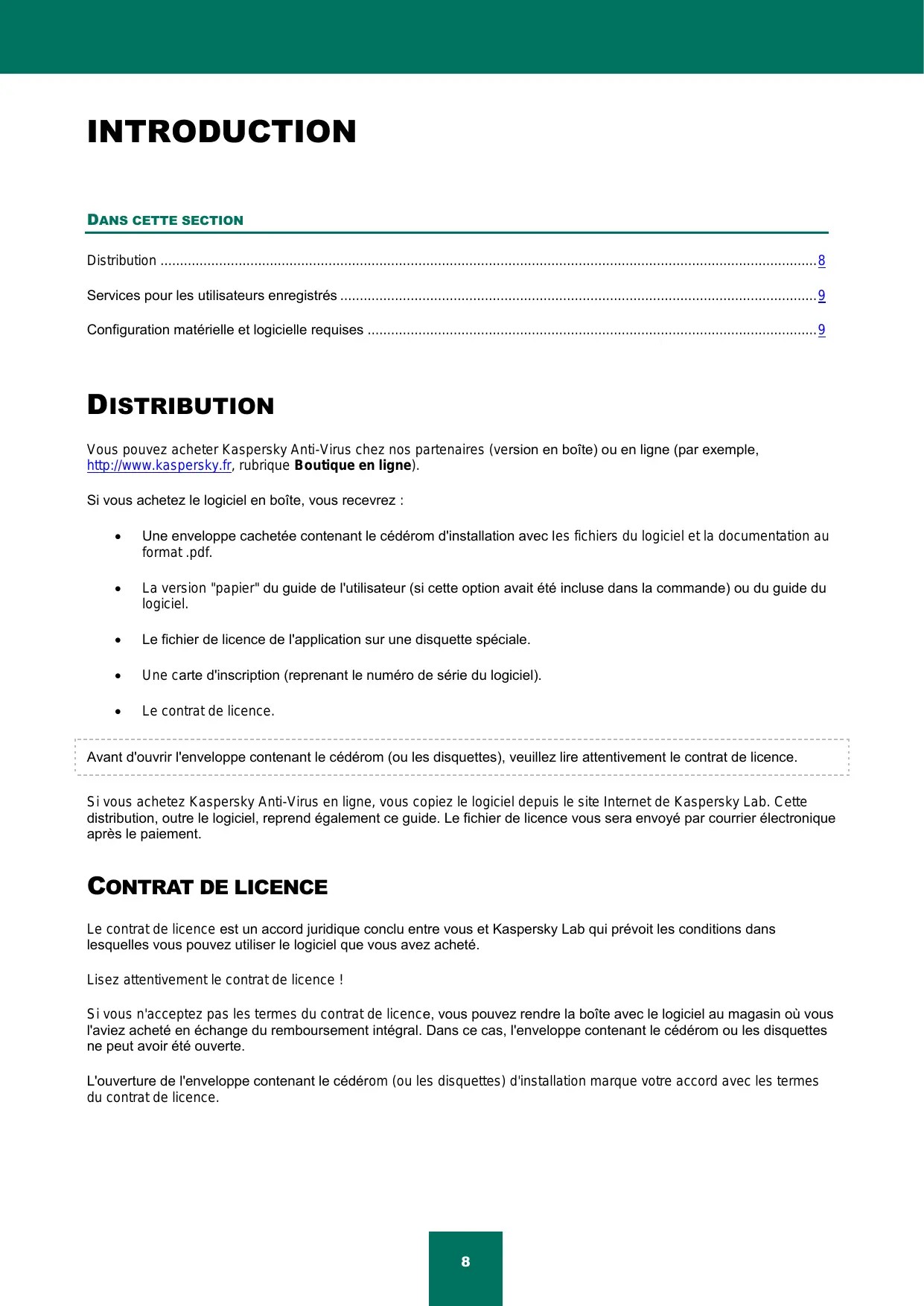 Distribution ........................................................................................................................................................................ 8 Services pour les utilisateurs enregistrés .......................................................................................................................... 9 Configuration matérielle et logicielle requises ................................................................................................................... 9 DISTRIBUTION Vous pouvez acheter Kaspersky Anti-Virus chez nos partenaires (version en boîte) ou en ligne (par exemple, http://www.kaspersky.fr, rubrique Boutique en ligne). Si vous achetez le logiciel en boîte, vous recevrez :