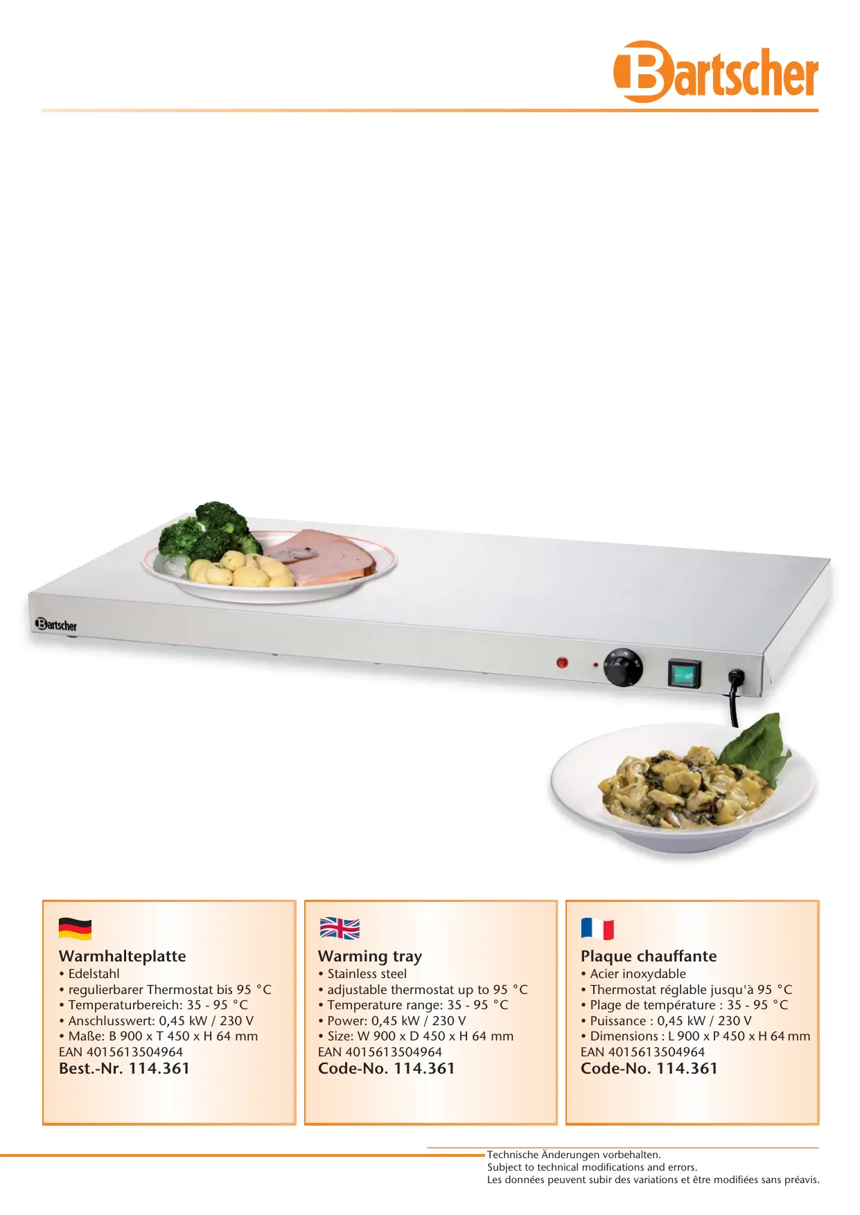 - Dimensions : L 900 x P 450 x H 64 mm EAN 4015613504964 Best.-Nr. 114.361 Code-No. 114.361 Code-No. 114.361 Technische Änderungen vorbehalten. Subject to technical modifications and errors. Les données peuvent subir des variations et être modifiées sans préavis.