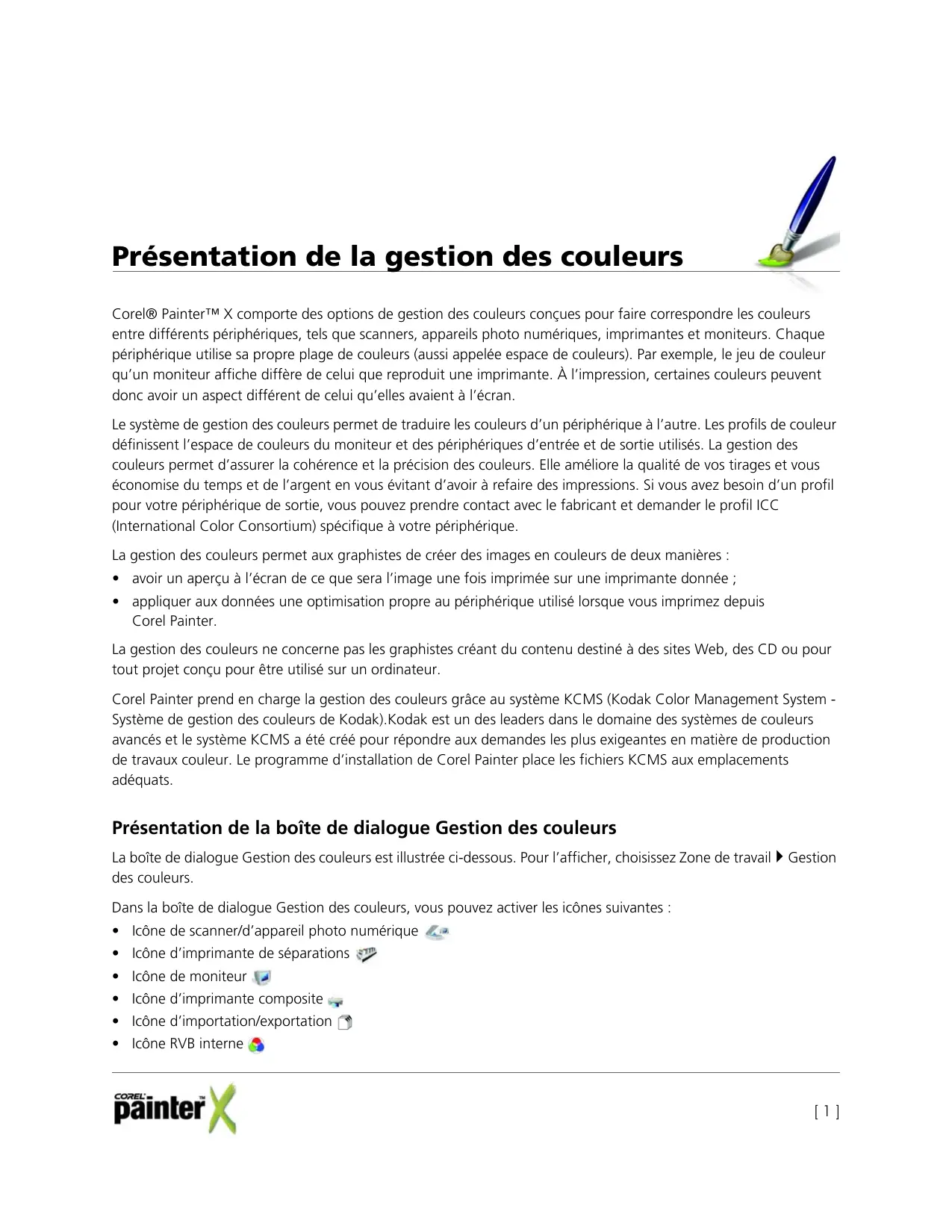 Corel Painter prend en charge la gestion des couleurs grâce au système KCMS (Kodak Color Management System - Système de gestion des couleurs de Kodak). Kodak est un des leaders dans le domaine des systèmes de couleurs avances et le système KCMS a été créé pour répondre aux demandes les plus exigeantes en matière de production de travaux couleur. Le programme d'installation de Corel Painter place les fichiers KCMS aux emplacements déquats.