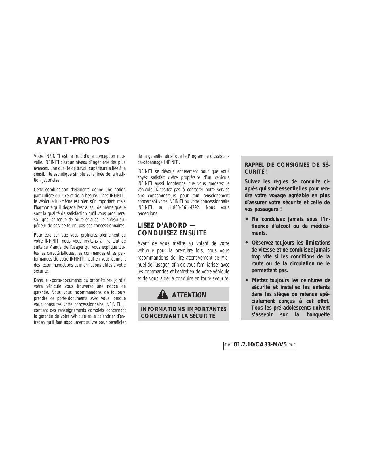 AVANT -PROPOS Votre INFINITI est le fruit dāune conception nouvelle. INFINITI cāest un niveau dāingeĢnierie des plus avanceĢs, une qualiteĢ de travail supeĢrieure allieĢe aĢ la sensibiliteĢ estheĢtique simple et raffineĢe de la tradition japonaise. Cette combinaison dāeĢleĢments donne une notion particulieĢre du luxe et de la beauteĢ. Chez INFINITI, le veĢhicule lui-meĢme est bien suĢr important, mais lāharmonie quāil deĢgage lāest aussi, de meĢme que le sont la qualiteĢ de satisfaction quāil vous procurera, sa ligne, sa tenue de route et aussi le niveau supeĢrieur de service fourni pas ses concessionnaires. Pour eĢtre suĢr que vous profiterez pleinement de votre INFINITI nous vous invitons aĢ lire tout de suite ce Manuel de lāusager qui vous explique toutes les caracteĢristiques, les commandes et les performances de votre INFINITI, tout en vous donnant des recommandations et informations utiles aĢ votre seĢcuriteĢ. Dans le Ā«porte-documents du proprieĢtaireĀ» joint aĢ votre veĢhicule vous trouverez une notice de garantie. Nous vous recommandons de toujours prendre ce porte-documents avec vous lorsque vous consultez votre concessionnaire INFINITI. Il contient des renseignements complets concernant la garantie de votre veĢhicule et le calendrier dāentretien quāil faut absolument suivre pour beĢneĢficier