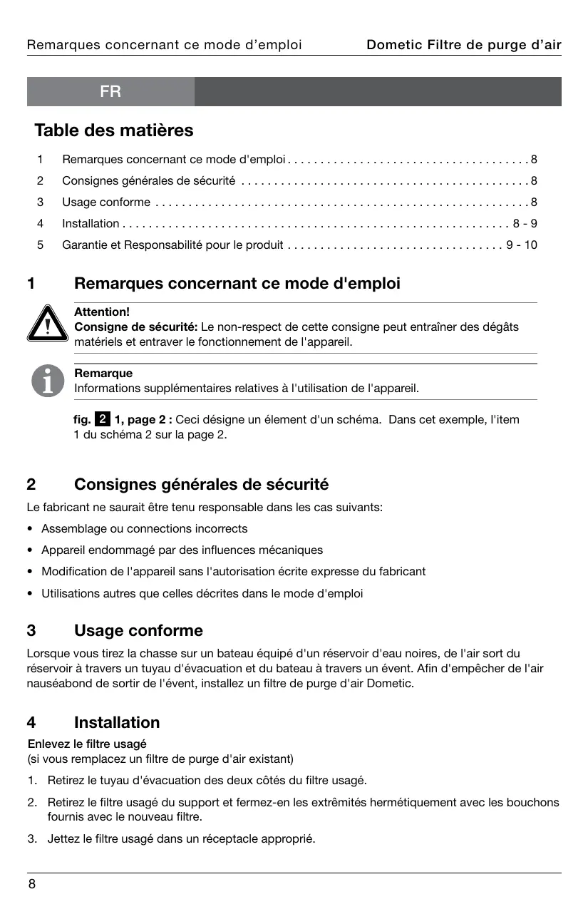 1. Choisissez un endroit pour installer le filtre. Evitez les zones à proximité de sources de chaleur excessives (collecteurs, lumières, etc.). Ne pas installer le filtre en dessous du couvercle du réservoir à eau noires (fig. 1 page 2). 2. Le filtre peut être monté à n’importe quel angle. En installant le filtre près de l'évent de coque, vous réduisez les risques de dégâts au filtre dus à un éventuel surremplissage du réservoir d'eaux noires. 3. Installez le support de montage (fig. 2 1, page 2) avec des fermoirs (fig. 2 2, page 2). 4. Inserez le filtre de purge d'air dans le support de montage en appuyant (fig. 3 6, page 2). 5. Installez des adaptateurs de tuyau 5/8 de pouce ou 3/4 de pouce (16 mm ou 19 mm) (fig. 3 4, page 2) des deux côtés du filtre, et assurez-vous que les joints en caoutchou (fig. 3 5, page 2) sont en place. Serrez 1/4 de tour ou 1/2 de tour au-delà de ce qui est nécessaire pour ouvrir manuellement. 6. En utilisant des colliers de serrage (fig. 3 3, page 2) (non fournis avec le filtre de purge d'air), connectez les tuyaux d'évacuation 16 mm ou 19 mm (5/8 de pouce or 3/4 de pouce) (fig. 3 2, page 2) du réservoir d'eaux noires et de l'évent de coque (fig. 3 1, page 2) aux adaptateurs sur le filtre. Attention ! Ne pas utiliser le filtre de purge d'air ®Dometic sur les réservoirs d'eaux noires dont les boues sont traitées par un système d'évacuation utilisant du chlore ou d'autres agents oxydants puissants. Attention ! Si un débordement accidentel se produit, remplacez le filtre de purge d'air immédiatement. Remarque Remplacez le filtre de purge d'air au début de chaque saison de plaisance afin de limiter les odeurs.