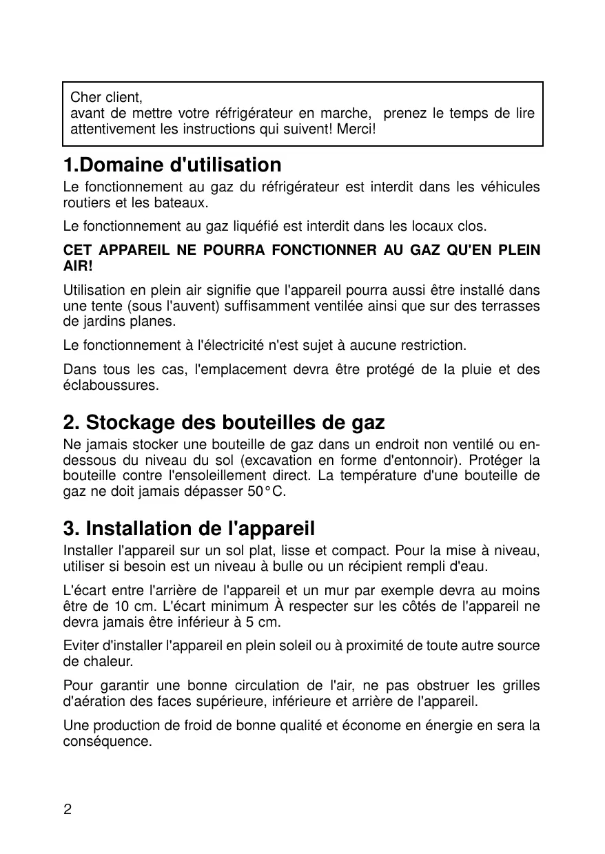 Le fonctionnement au gaz du réfrigérateur est interdit dans les vehicules routiers et les bateaux.
