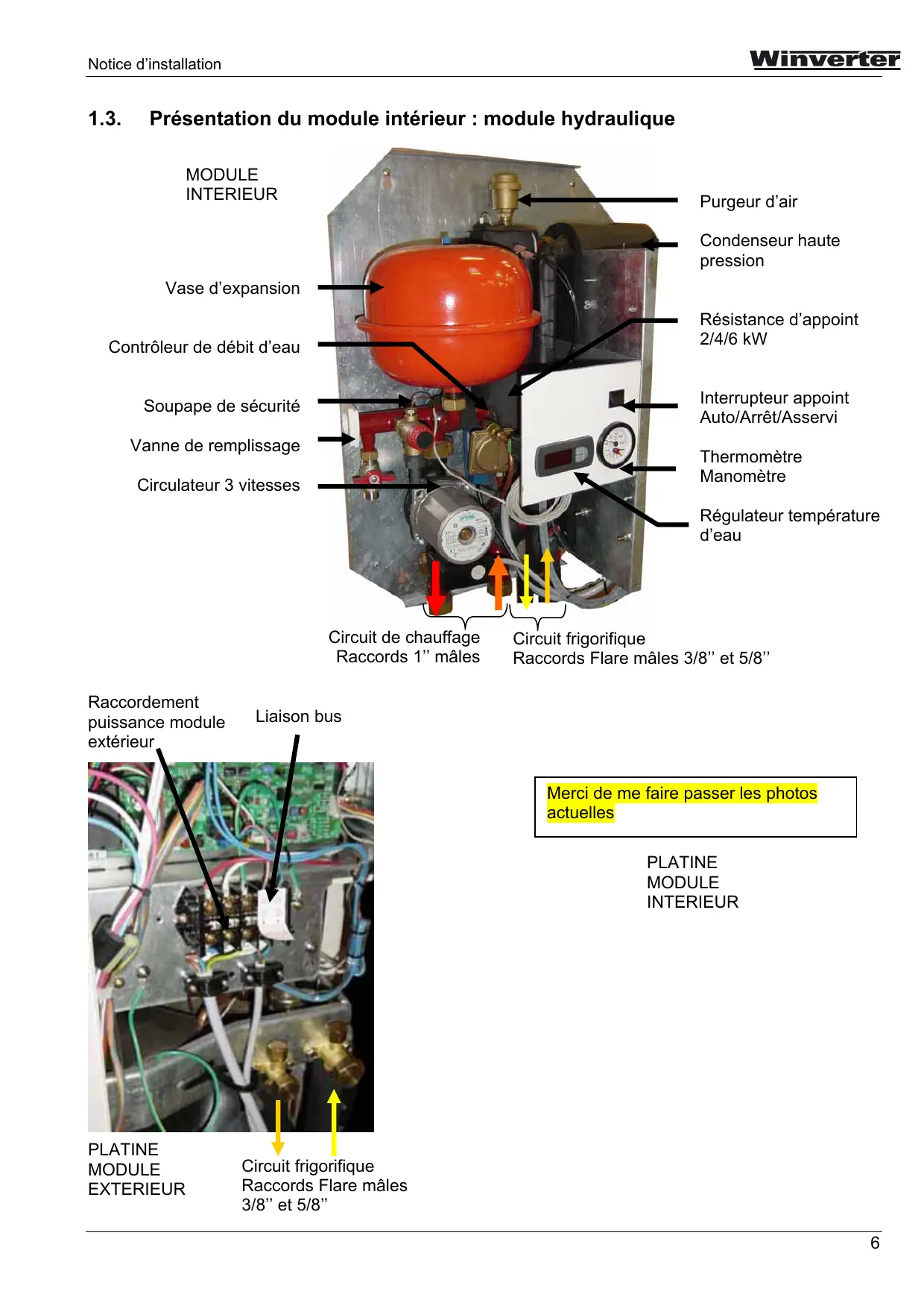 Notice d’installation 6.1. Raccordement chauffage mono-énergie (système base+appoint éventuel) L’installateur devra raccorder le circuit d’eau de chauffage: entrée et sortie vers les collecteurs du plancher chauffant ou radiateurs basse température (à calorifuger dans les locaux non chauffés. Pour l’installation, se référer aux schémas types n° … à …., fournis en annexe. Seul le respect des schémas types fournis permet le fonctionnement correct du système Winverter. Un appoint électrique est intégré au module intérieur, il est activé par le deuxième étage de la carte électronique de régulation. Le régulateur placé en façade du module intérieur est un thermostat électronique qui limite la température de départ d’eau chaude de la résistance d’appoint et permet de fonctionner en mode secours sur la résistance. Ce régulateur à deux étages permet également de limiter la température de départ d’eau glacée en mode froid. La résistance d’appoint comporte 3 résistances de 2 kW. Un pontage permet de régler l’appoint à l’installation, au choix : 0, 2, 4 ou 6 kW selon le pontage effectué. Le montage usine est de 6 kW. 6.2. Raccordement chauffagebi-énergie (relève de chaudière) Pour l’installation, se référer aux schémas types n° …. à …. , fournis en annexe.