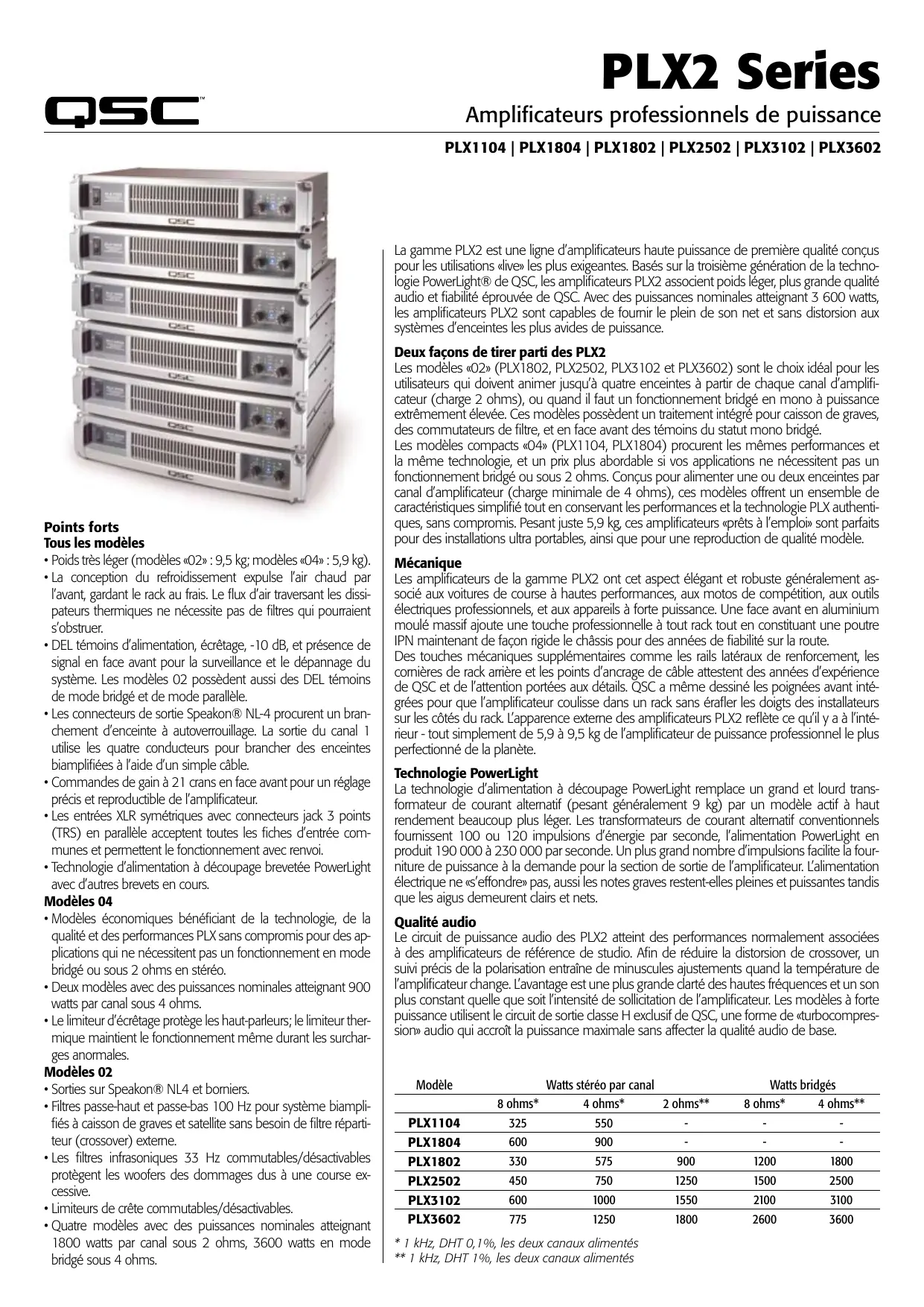 Deux façons de tirer parti des PLX2 Les modèles «02» (PLX1802, PLX2502, PLX3102 et PLX3602) sont le choix idéal pour les utilisateurs qui doivent animer jusqu’à quatre enceintes à partir de chaque canal d’amplificateur (charge 2 ohms), ou quand il faut un fonctionnement bridgé en mono à puissance extrêmement élevée. Ces modèles possèdent un traitement intégré pour caisson de graves, des commutateurs de filtre, et en face avant des témoins du statut mono bridgé. Les modèles compacts «04» (PLX1104, PLX1804) procurent les mêmes performances et la même technologie, et un prix plus abordable si vos applications ne nécessitent pas un fonctionnement bridgé ou sous 2 ohms. Conçus pour alimenter une ou deux enceintes par canal d’amplificateur (charge minimale de 4 ohms), ces modèles offrent un ensemble de caractéristiques simplifié tout en conservant les performances et la technologie PLX authentiques, sans compromis. Pesant juste 5,9 kg, ces amplificateurs «prêts à l’emploi» sont parfaits pour des installations ultra portables, ainsi que pour une reproduction de qualité modèle. Mécanique Les amplificateurs de la gamme PLX2 ont cet aspect élégant et robuste généralement associé aux voitures de course à hautes performances, aux motos de compétition, aux outils électriques professionnels, et aux appareils à forte puissance. Une face avant en aluminium moulé massif ajoute une touche professionnelle à tout rack tout en constituant une poutre IPN maintenant de façon rigide le châssis pour des années de fiabilité sur la route. Des touches mécaniques supplémentaires comme les rails latéraux de renforcement, les cornières de rack arrière et les points d’ancrage de câble attestent des années d’expérience de QSC et de l’attention portées aux détails. QSC a même dessiné les poignées avant intégrées pour que l’amplificateur coulisse dans un rack sans érafler les doigts des installateurs sur les côtés du rack. L’apparence externe des amplificateurs PLX2 reflète ce qu’il y a à l’intérieur - tout simplement de 5,9 à 9,5 kg de l’amplificateur de puissance professionnel le plus perfectionné de la planète. Technologie PowerLight La technologie d’alimentation à découpage PowerLight remplace un grand et lourd transformateur de courant alternatif (pesant généralement 9 kg) par un modèle actif à haut rendement beaucoup plus léger. Les transformateurs de courant alternatif conventionnels fournissent 100 ou 120 impulsions d’énergie par seconde, l’alimentation PowerLight en produit 190 000 à 230 000 par seconde. Un plus grand nombre d’impulsions facilite la fourniture de puissance à la demande pour la section de sortie de l’amplificateur. L’alimentation électrique ne «s’effondre» pas, aussi les notes graves restent-elles pleines et puissantes tandis que les aigus demeurent clairs et nets. Qualité audio Le circuit de puissance audio des PLX2 atteint des performances normalement associées à des amplificateurs de référence de studio. Afin de réduire la distorsion de crossover, un suivi précis de la polarisation entraîne de minuscules ajustements quand la température de l’amplificateur change. L’avantage est une plus grande clarté des hautes fréquences et un son plus constant quelle que soit l’intensité de sollicitation de l’amplificateur. Les modèles à forte puissance utilisent le circuit de sortie classe H exclusif de QSC, une forme de «turbocompression» audio qui accroît la puissance maximale sans affecter la qualité audio de base.