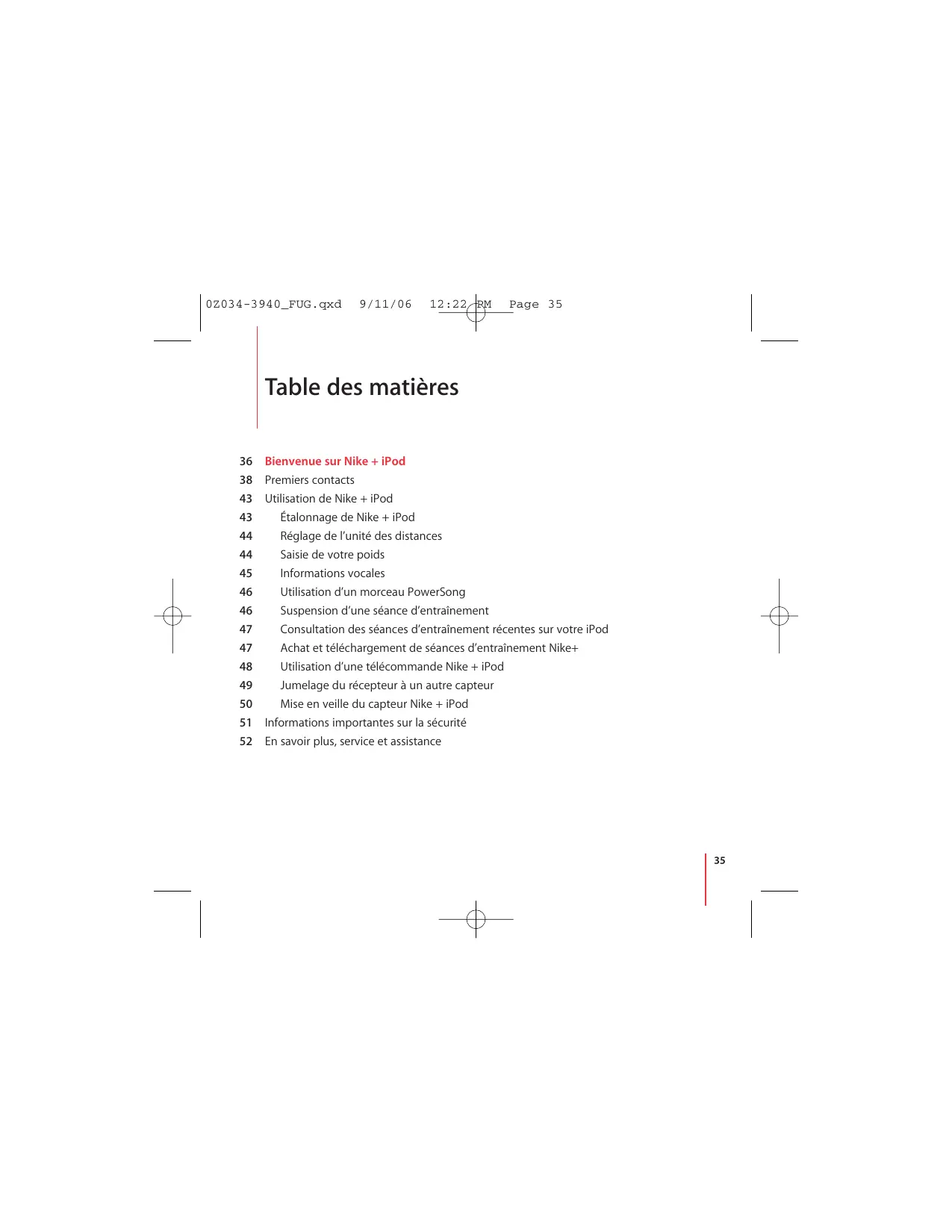 36 Bienvenue sur Nike + iPod 38 Premiers contacts 43 Utilisation de Nike + iPod 43 Étalonnage de Nike + iPod 44 Réglage de l'unité des distances 44 Saisie de votre poids 45 Informations vocales 46 Utilisation d'un morceau PowerSong 46 Suspension d'une séance d'entraînement 47 Consultation des séances d'entraînement récentes sur votre iPod 47 Achat et téléchargement de séances d'entraînement Nike+ 48 Utilisation d'une télécommande Nike + iPod 49 Jumelage du récepteur à un autre capteur 50 Mise en veille du capteur Nike + iPod 51 Informations importantes sur la sécurité 52 En savoir plus, service et assistance