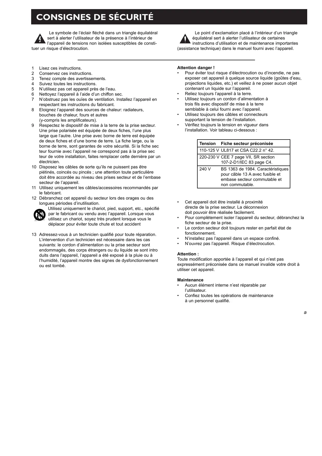 12 Debranche cet appeareil du secteur lors des orages ou des longues périodes d'inutilisation.