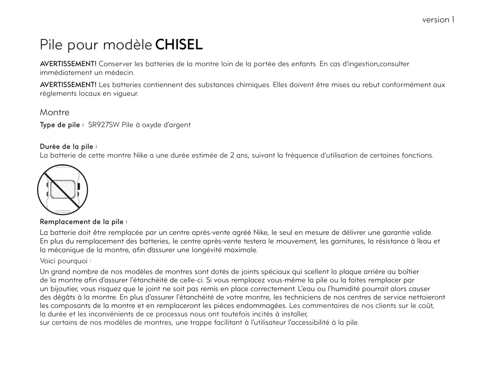 La batterie doit être remplaçée par un centre après-vente agréé Nike, le seul en mesure de délivrer une garantie valide. En plus du remplacement des batteries, le centre après-vente testera le mouvement, les garnitures, la résistance à l'eau et la mécanique de la montre, afin d'assurer une longévité maximale.