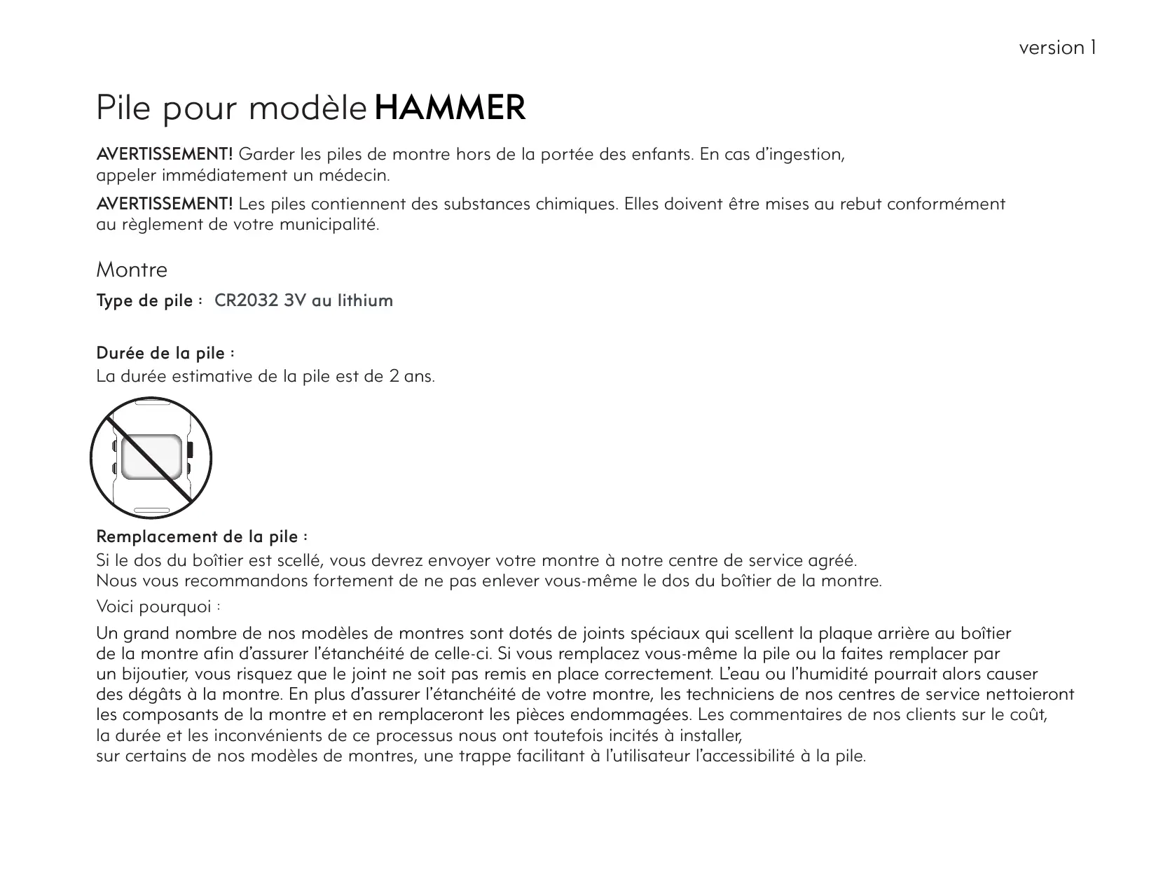 | Risques liés à l'humidité | Peut endommager la montre si la pile est mal remplacée |