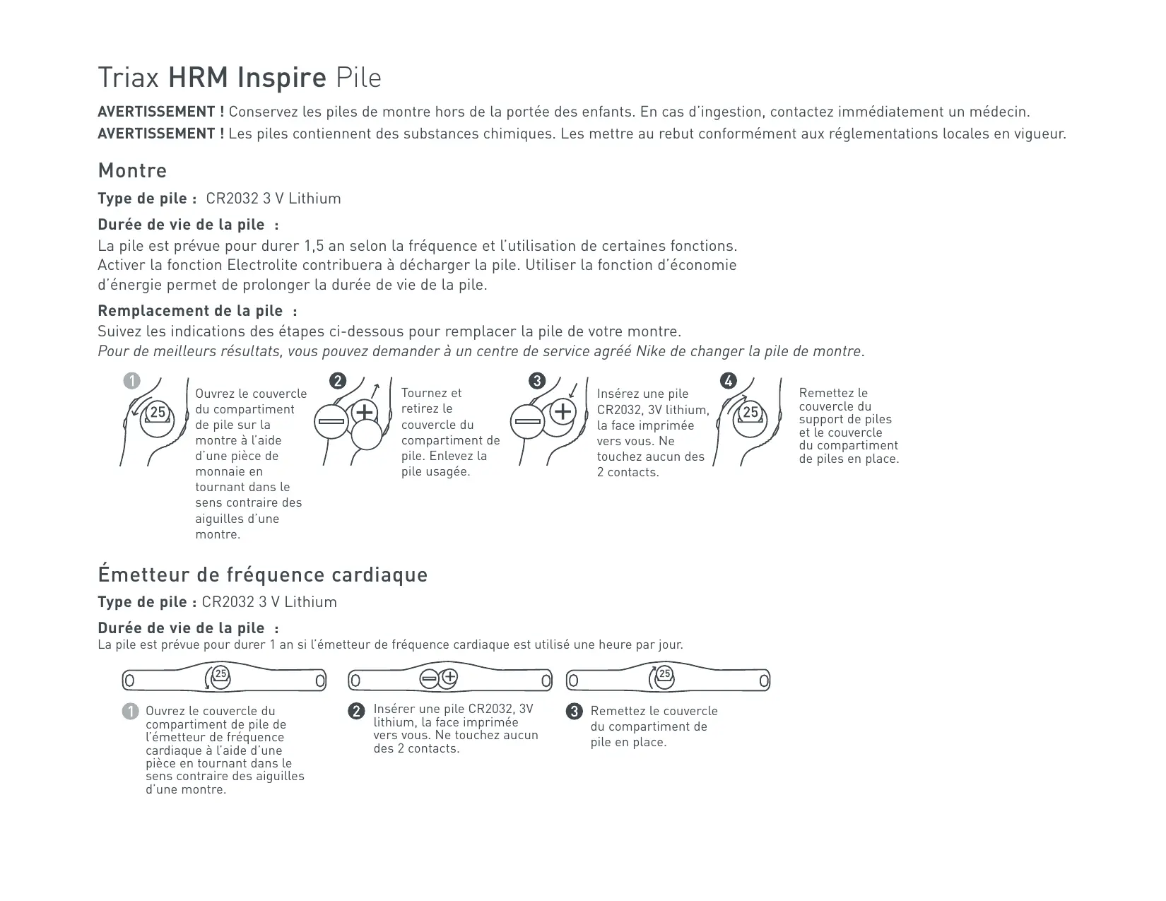 AVERTISSEMENT! Conservez les piles de montre hors de la portée des enfants. En cas d'ingestion, contactez immédiatement un médecin.