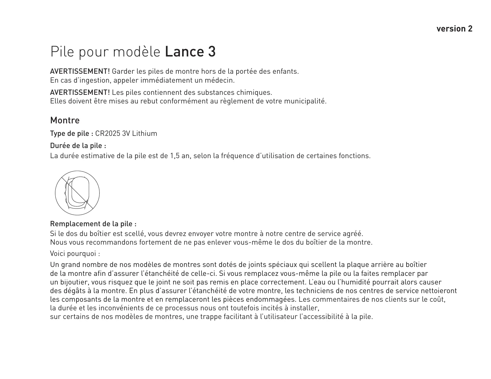 AVERTISSEMENT! Garder les piles de montre hors de la portée des enfants.