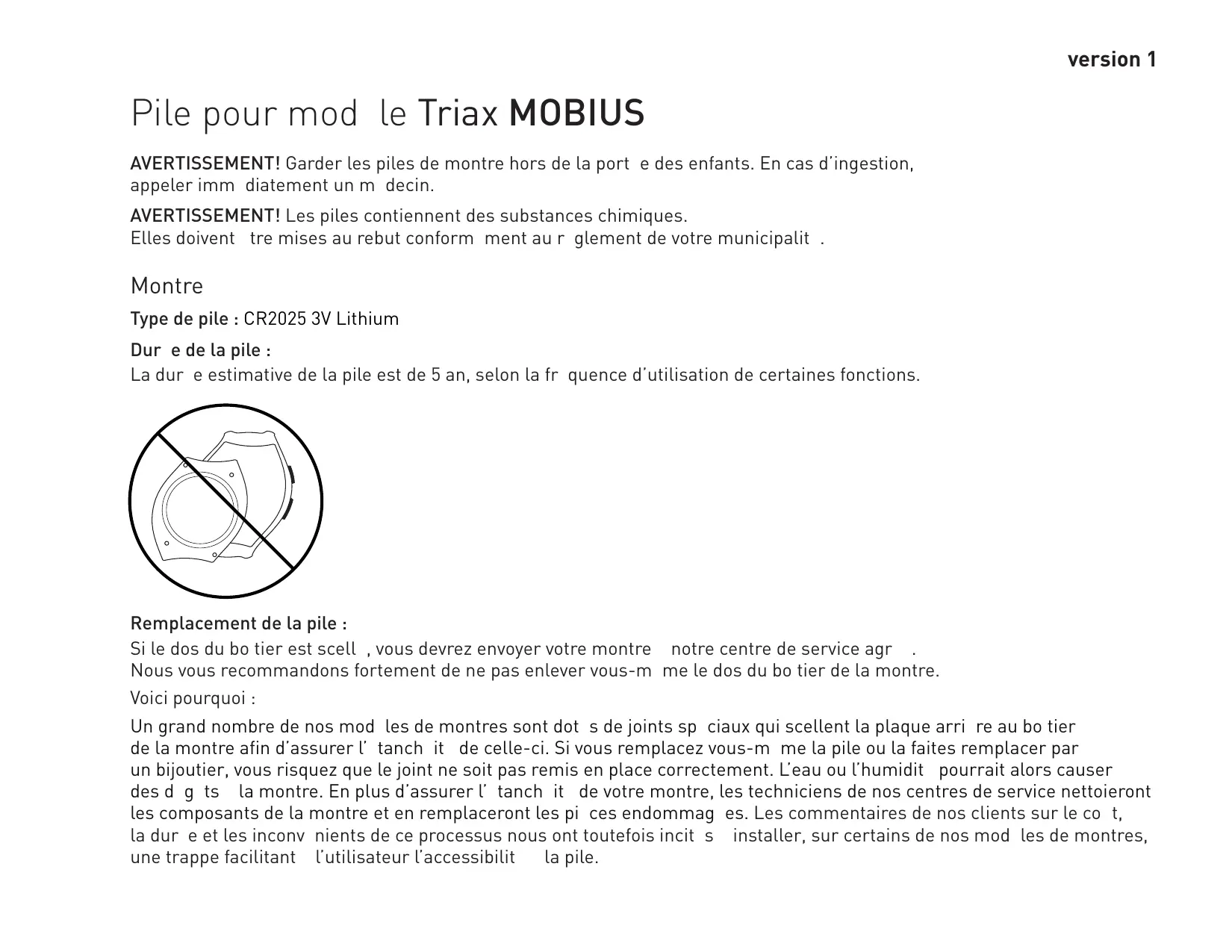 AVERTISSEMENT! Garder les piles de montre hors de la port e des enfants. En cas d'ingestion, appeler imm diatement un m decin.