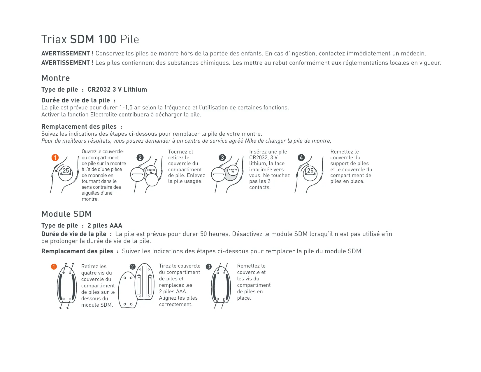 Triax SDM 100 Pile AVERTISSEMENT ! Conservez les piles de montre hors de la portée des enfants. En cas d’ingestion, contactez immédiatement un médecin. AVERTISSEMENT ! Les piles contiennent des substances chimiques. Les mettre au rebut conformément aux réglementations locales en vigueur. Montre Type de pile : CR2032 3 V Lithium Durée de vie de la pile : La pile est prévue pour durer 1-1,5 an selon la fréquence et l’utilisation de certaines fonctions. Activer la fonction Electrolite contribuera à décharger la pile. Remplacement des piles : Suivez les indications des étapes ci-dessous pour remplacer la pile de votre montre. Pour de meilleurs résultats, vous pouvez demander à un centre de service agréé Nike de changer la pile de montre. Ouvrez le couvercle du compartiment de pile sur la montre à l’aide d’une pièce de monnaie en tournant dans le sens contraire des aiguilles d’une montre. Tournez et retirez le couvercle du compartiment de pile. Enlevez la pile usagée. Insérez une pile CR2032, 3 V lithium, la face imprimée vers vous. Ne touchez pas les 2 contacts. Remettez le couvercle du support de piles et le couvercle du compartiment de piles en place. Module SDM Type de pile : 2 piles AAA Durée de vie de la pile : La pile est prévue pour durer 50 heures. Désactivez le module SDM lorsqu’il n’est pas utilisé afin de prolonger la durée de vie de la pile. Remplacement des piles : Suivez les indications des étapes ci-dessous pour remplacer la pile du module SDM.