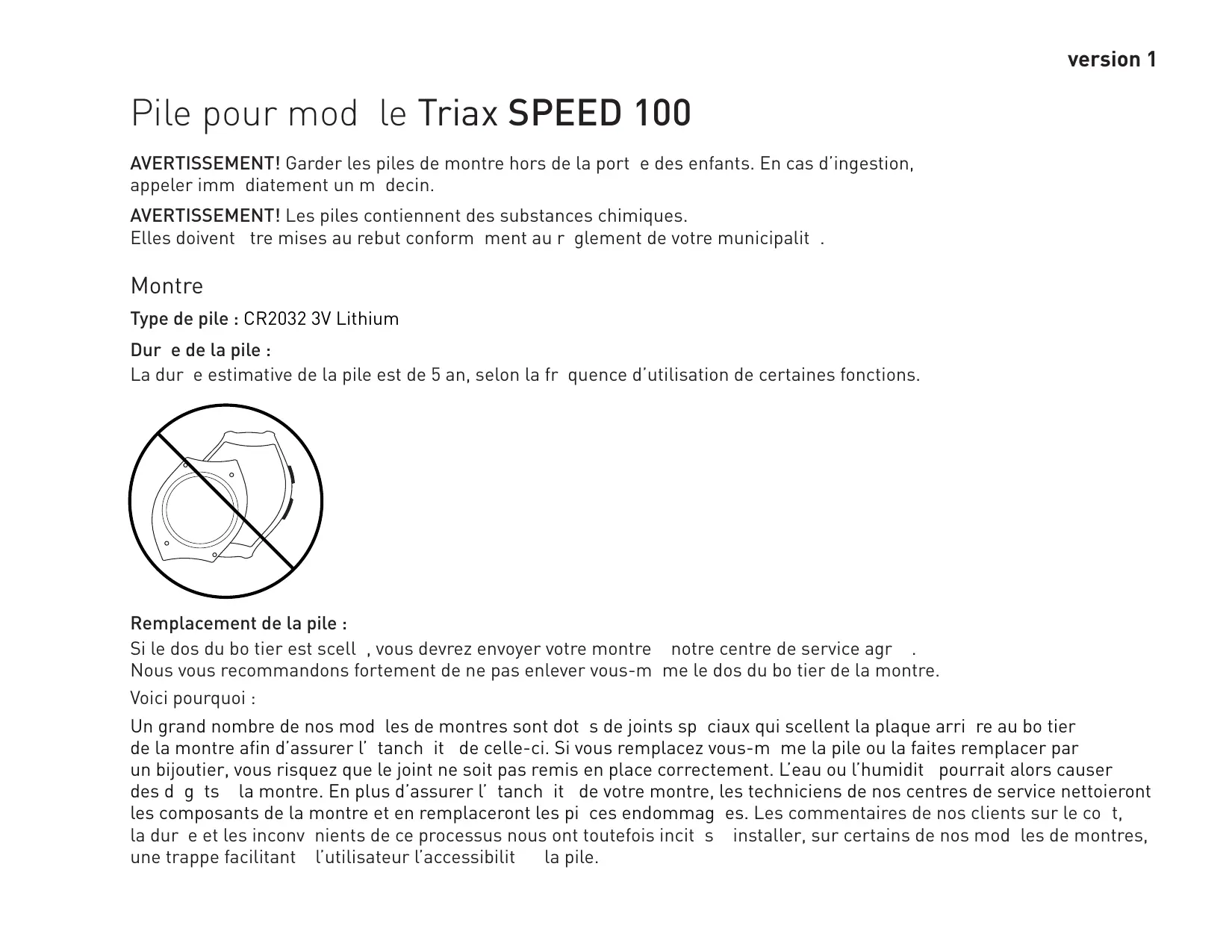 version 1 Pile pour modèle Triax SPEED 100 AVERTISSEMENT! Garder les piles de montre hors de la portée des enfants. En cas d’ingestion, appeler immédiatement un médecin. AVERTISSEMENT! Les piles contiennent des substances chimiques. Elles doivent être mises au rebut conformément au règlement de votre municipalité. Montre Type de pile : CR2032 3V Lithium Durée de la pile : La durée estimative de la pile est de 5 an, selon la fréquence d’utilisation de certaines fonctions. Remplacement de la pile : Si le dos du boîtier est scellé, vous devrez envoyer votre montre à notre centre de service agréé. Nous vous recommandons fortement de ne pas enlever vous-même le dos du boîtier de la montre. Voici pourquoi : Un grand nombre de nos modèles de montres sont dotés de joints spéciaux qui scellent la plaque arrière au boîtier de la montre afin d’assurer l’étanchéité de celle-ci. Si vous remplacez vous-même la pile ou la faites remplacer par un bijoutier, vous risquez que le joint ne soit pas remis en place correctement. L’eau ou l’humidité pourrait alors causer des dégâts à la montre. En plus d’assurer l’étanchéité de votre montre, les techniciens de nos centres de service nettoieront les composants de la montre et en remplaceront les pièces endommagées. Les commentaires de nos clients sur le coût, la durée et les inconvénients de ce processus nous ont toutefois incités à installer, sur certains de nos modèles de montres, une trappe facilitant à l’utilisateur l’accessibilité à la pile.
