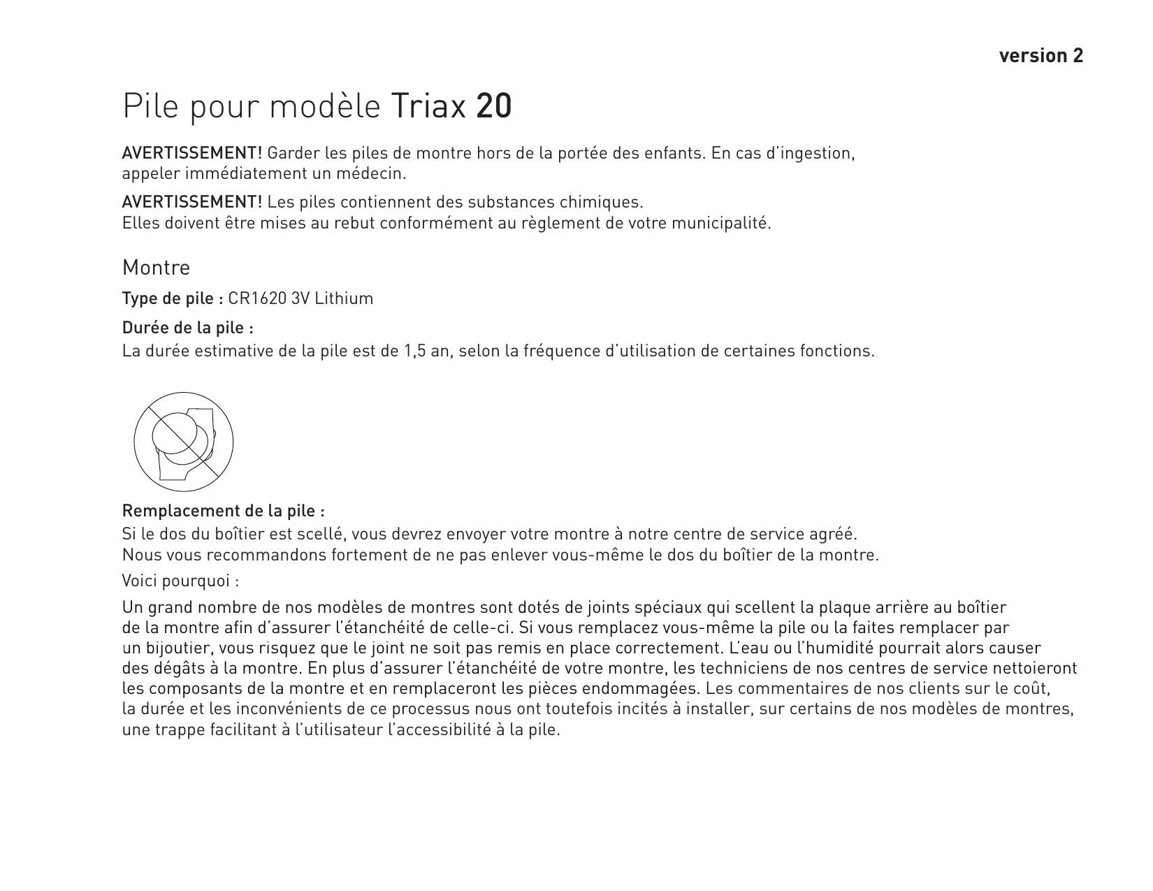 version 2 Pile pour modèle Triax 20 AVERTISSEMENT! Garder les piles de montre hors de la portée des enfants. En cas d’ingestion, appeler immédiatement un médecin. AVERTISSEMENT! Les piles contiennent des substances chimiques. Elles doivent être mises au rebut conformément au règlement de votre municipalité. Montre Type de pile : CR1620 3V Lithium Durée de la pile : La durée estimative de la pile est de 1,5 an, selon la fréquence d’utilisation de certaines fonctions. Remplacement de la pile : Si le dos du boîtier est scellé, vous devrez envoyer votre montre à notre centre de service agréé. Nous vous recommandons fortement de ne pas enlever vous-même le dos du boîtier de la montre. Voici pourquoi : Un grand nombre de nos modèles de montres sont dotés de joints spéciaux qui scellent la plaque arrière au boîtier de la montre afin d’assurer l’étanchéité de celle-ci. Si vous remplacez vous-même la pile ou la faites remplacer par un bijoutier, vous risquez que le joint ne soit pas remis en place correctement. L’ L eau ou l’humidité pourrait alors causer des dégâts à la montre. En plus d’assurer l’étanchéité de votre montre, les techniciens de nos centres de service nettoieront les composants de la montre et en remplaceront les pièces endommagées. Les commentaires de nos clients sur le coût, la durée et les inconvénients de ce processus nous ont toutefois incités à installer, sur certains de nos modèles de montres, une trappe facilitant à l’utilisateur l’accessibilité à la pile.