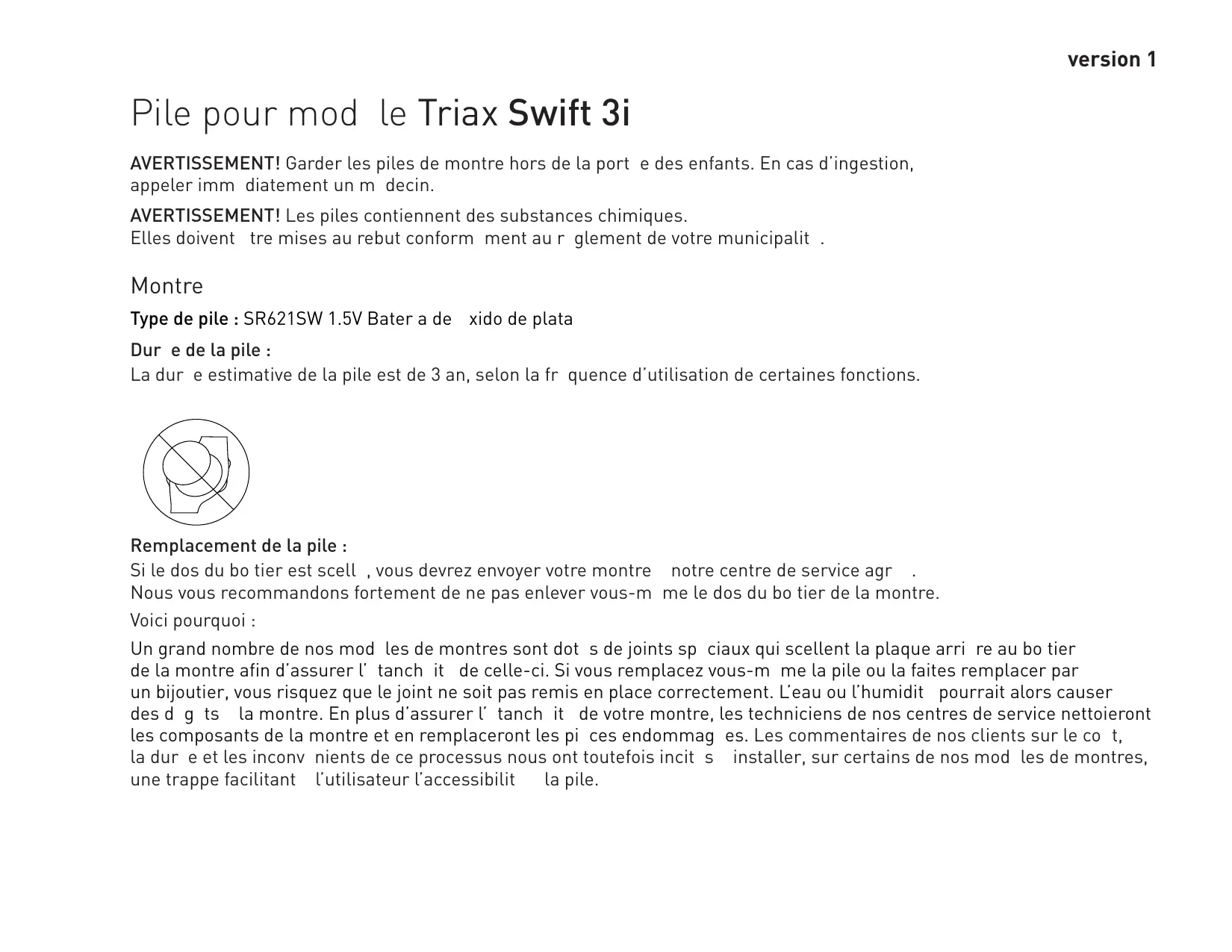 version 1 Pile pour modèle Triax Swift 3i AVERTISSEMENT! Garder les piles de montre hors de la portée des enfants. En cas d’ingestion, appeler immédiatement un médecin. AVERTISSEMENT! Les piles contiennent des substances chimiques. Elles doivent être mises au rebut conformément au règlement de votre municipalité. Montre Type de pile : SR621SW 1.5V Batería de Óxido de plata Durée de la pile : La durée estimative de la pile est de 3 an, selon la fréquence d’utilisation de certaines fonctions. Remplacement de la pile : Si le dos du boîtier est scellé, vous devrez envoyer votre montre à notre centre de service agréé. Nous vous recommandons fortement de ne pas enlever vous-même le dos du boîtier de la montre. Voici pourquoi : Un grand nombre de nos modèles de montres sont dotés de joints spéciaux qui scellent la plaque arrière au boîtier de la montre afin d’assurer l’étanchéité de celle-ci. Si vous remplacez vous-même la pile ou la faites remplacer par un bijoutier, vous risquez que le joint ne soit pas remis en place correctement. L’eau ou l’humidité pourrait alors causer des dégâts à la montre. En plus d’assurer l’étanchéité de votre montre, les techniciens de nos centres de service nettoieront les composants de la montre et en remplaceront les pièces endommagées. Les commentaires de nos clients sur le coût, la durée et les inconvénients de ce processus nous ont toutefois incités à installer, sur certains de nos modèles de montres, une trappe facilitant à l’utilisateur l’accessibilité à la pile.