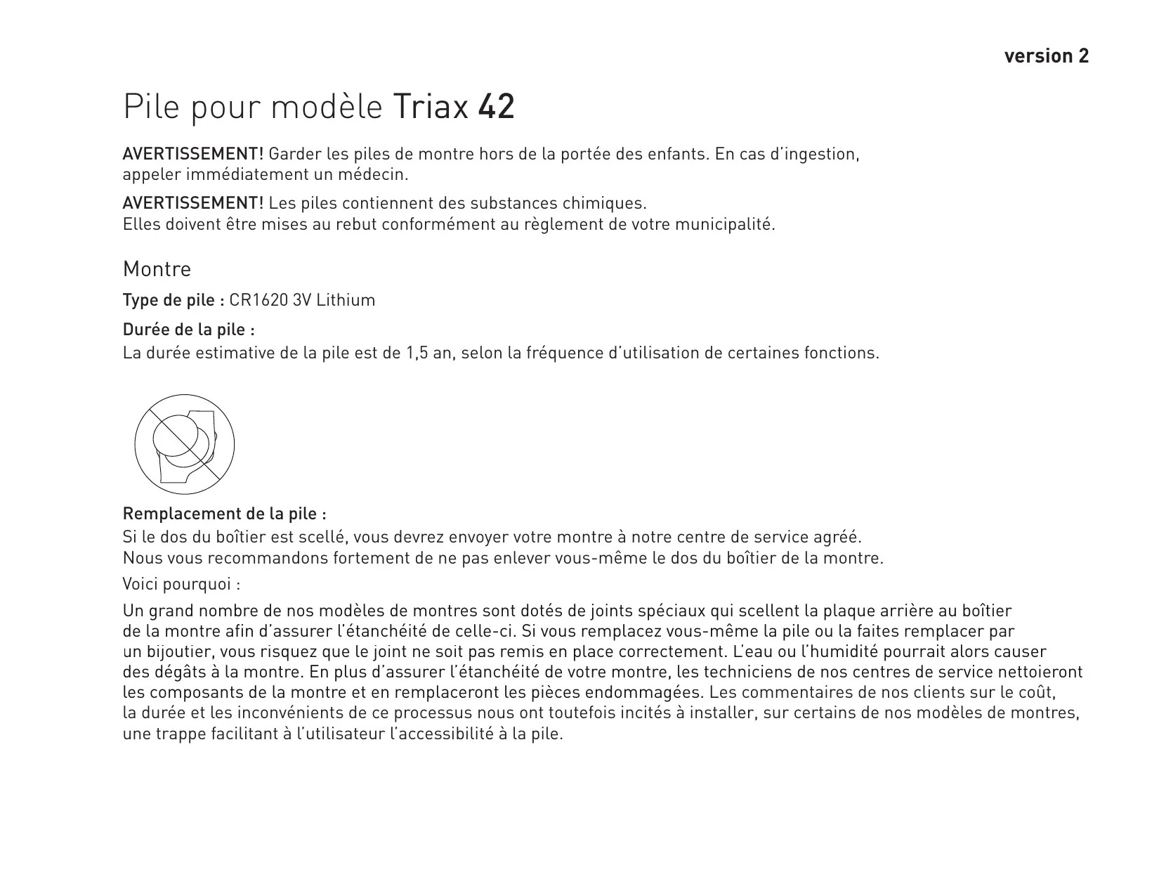 version 2 Pile pour modèle Triax 42 AVERTISSEMENT! Garder les piles de montre hors de la portée des enfants. En cas d’ingestion, appeler immédiatement un médecin. AVERTISSEMENT! Les piles contiennent des substances chimiques. Elles doivent être mises au rebut conformément au règlement de votre municipalité. Montre Type de pile : CR1620 3V Lithium Durée de la pile : La durée estimative de la pile est de 1,5 an, selon la fréquence d’utilisation de certaines fonctions. Remplacement de la pile : Si le dos du boîtier est scellé, vous devrez envoyer votre montre à notre centre de service agréé. Nous vous recommandons fortement de ne pas enlever vous-même le dos du boîtier de la montre. Voici pourquoi : Un grand nombre de nos modèles de montres sont dotés de joints spéciaux qui scellent la plaque arrière au boîtier de la montre afin d’assurer l’étanchéité de celle-ci. Si vous remplacez vous-même la pile ou la faites remplacer par un bijoutier, vous risquez que le joint ne soit pas remis en place correctement. L’ L eau ou l’humidité pourrait alors causer des dégâts à la montre. En plus d’assurer l’étanchéité de votre montre, les techniciens de nos centres de service nettoieront les composants de la montre et en remplaceront les pièces endommagées. Les commentaires de nos clients sur le coût, la durée et les inconvénients de ce processus nous ont toutefois incités à installer, sur certains de nos modèles de montres, une trappe facilitant à l’utilisateur l’accessibilité à la pile.