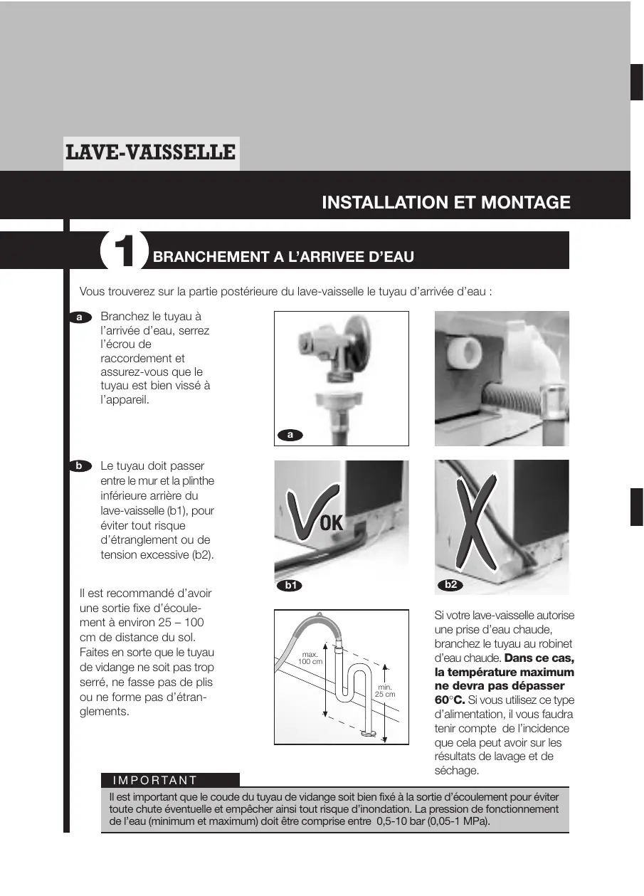 Le tuyau doit passer entre le mur et la plinthe inférieure arrière du lave-vaisselle (b1), pour éviter tout risque d’étranglement ou de tension excessive (b2). Il est recommandé d’avoir une sortie fixe d’écoulement à environ 25 – 100 cm de distance du sol. Faites en sorte que le tuyau de vidange ne soit pas trop serré, ne fasse pas de plis ou ne forme pas d’étranglements.