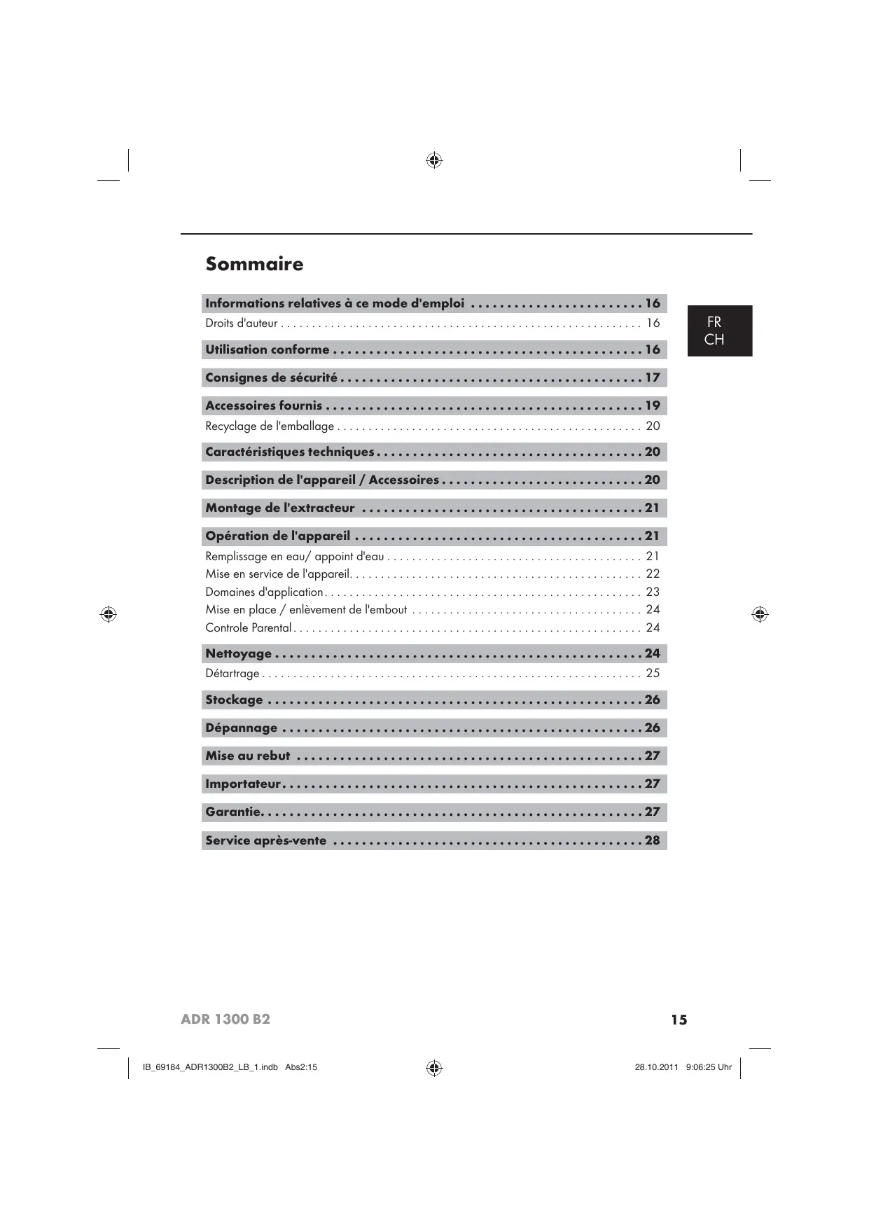 Mettez l'appareil au rebut en le confiant à une entreprise de traitement des déchets agréée ou au service de recyclage de votre commune. Respectez la réglementation en vigueur. En cas de doutes, contactez votre organisation de recyclage. Importateur KOMPERNASS GMBH BURGSTRASSE 21 44867 BOCHUM, GERMANY www.kompernass.com Garantie Cet appareil est garanti 3 ans à partir de la date d'achat. L'appareil a été fabriqué avec soin et consciencieusement contrôlé avant sa distribution. Veuillez conserver le ticket de caisse en guise de preuve d'achat. Dans le cas où la garantie s'applique, veuillez appeler le service après-vente compétent. Cette condition doit être respectée pour assurer l'expédition gratuite de votre marchandise. REMARQUE ► Cette garantie s'applique uniquement en cas de vice fabrication et ne couvre pas les éléments d'usure ou pour les dommages subis par des éléments fragiles, par ex. le commutateur. Le produit est exclusivement destiné à un usage privé et non commercial. La garantie est annulée en cas de manipulation incorrecte et inappropriée, d'utilisation brutale et en cas d'intervention qui n'aurait pas été réalisée par notre centre de service après-vente autorisée. Cette garantie ne constitue pas une restriction de vos droits légaux. La durée de la garantie n'est pas prolongée par l'exercice de la garantie. Ceci vaut également pour les pièces remplacées et réparées. Tous dommages et défauts présents dès l'achat doivent être notifiés dès que le produit est déballé, et au plus tard deux jours après la date d'achat. Toute réparation survenant après la période sous garantie fera l'objet d'une facture. ADR 1300 B2 IB_69184_ADR1300B2_LB_1.indb Abs3:27