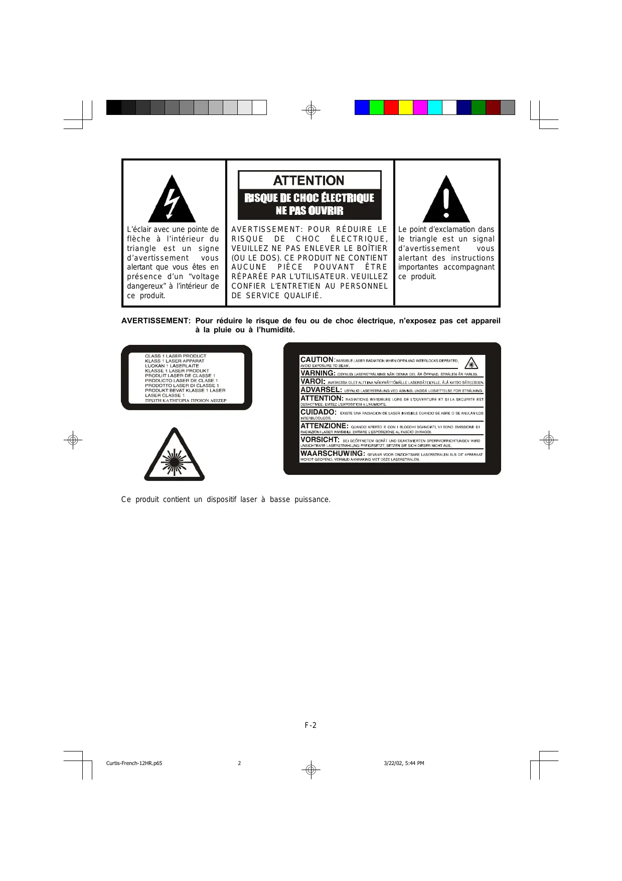 AVERTISSEMENT: Pour réduire le risque de feu ou de chic électrique, n'exposez pas cet apparéil à la pluie ou à l'humidité.