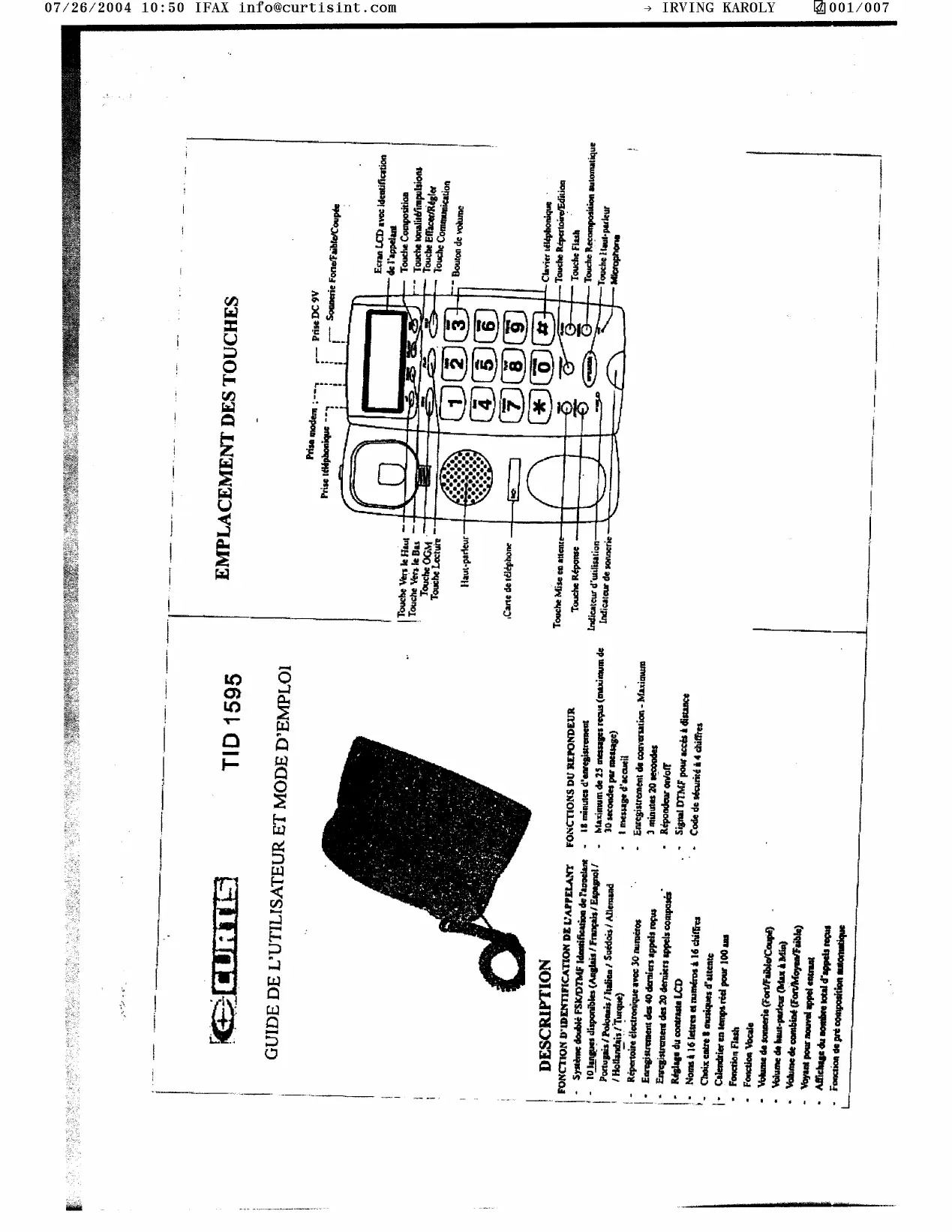 EMPLACEMENT DES TOUCHES TID 1595 GUIDE DE L'UTILISATEUR ET MODE D'EMPLOI