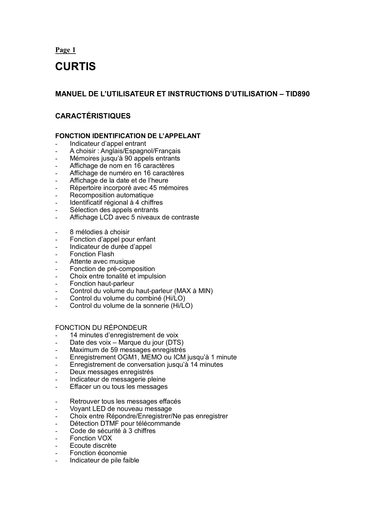 TID890 - Téléphone fixe CURTIS - Notice d'utilisation et mode d'emploi gratuit