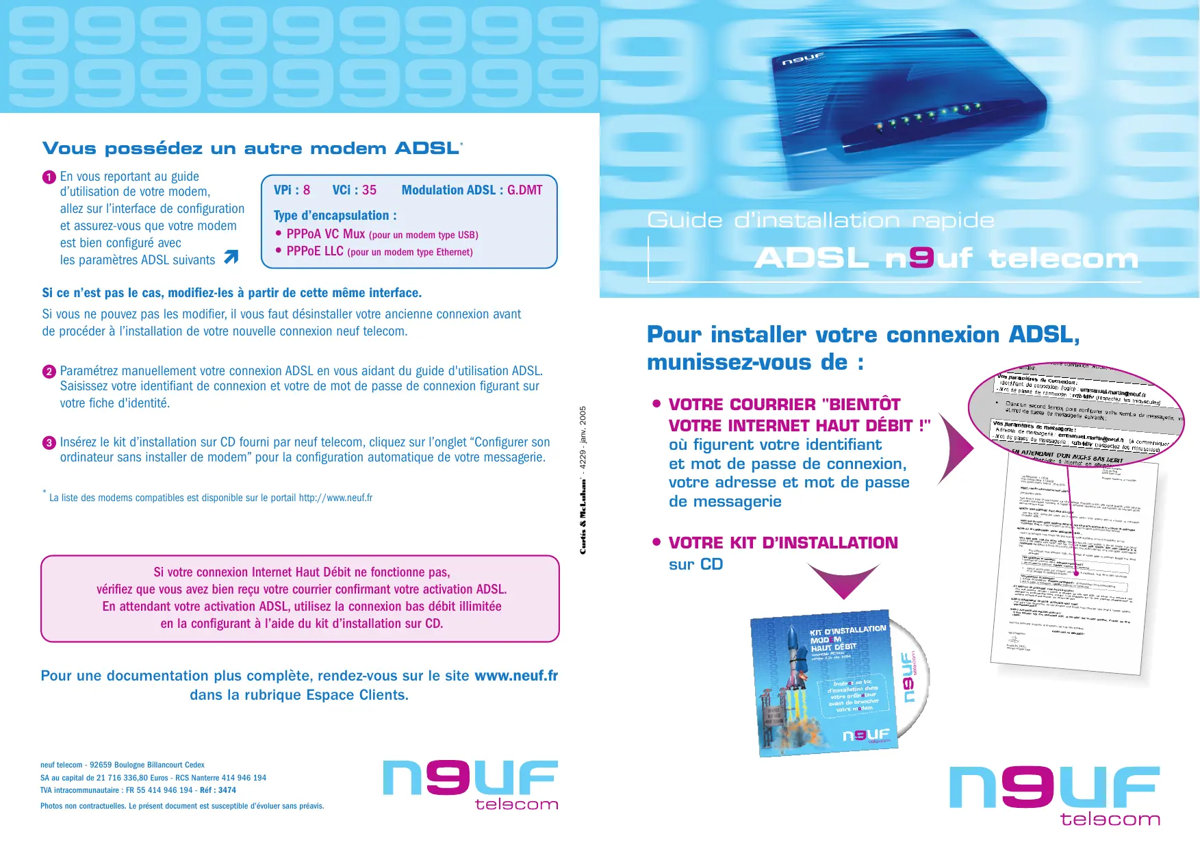 Paramétrez manuellement votre connexion ADSL en vous aidant du guide d'utilisation ADSL. Saisissez votre identifiant de connexion et votre mot de passe de connexion figurant sur votre fiche d'identité. Insérez le kit d'installation sur CD fourni par neuf telecom, cliquez sur l'onglet "Configurer ordinateur sans installer de modem" pour la configuration automatique de votre messagerie.