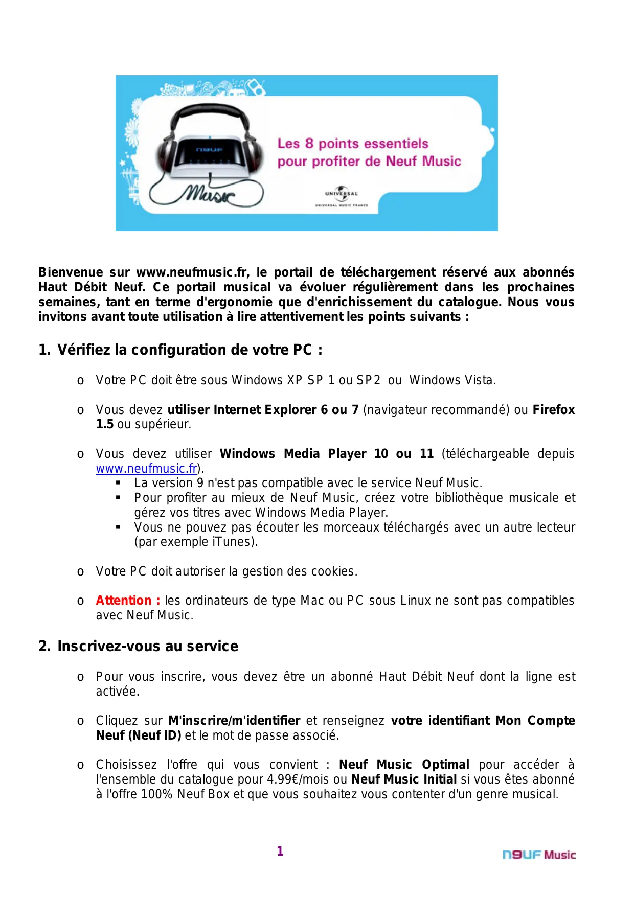 Bienvenue sur www.neufmusic.fr, le portail de téléchargement réservé aux abonnés Haut Débit Neuf. Ce portail musical va évoluer régulièrement dans les prochainsines semaines, tant en terme d'ergonomie que d'enrichissement du catalogue. Nous vous invitons avant toute utilisation à dire attentivement les points suivants :