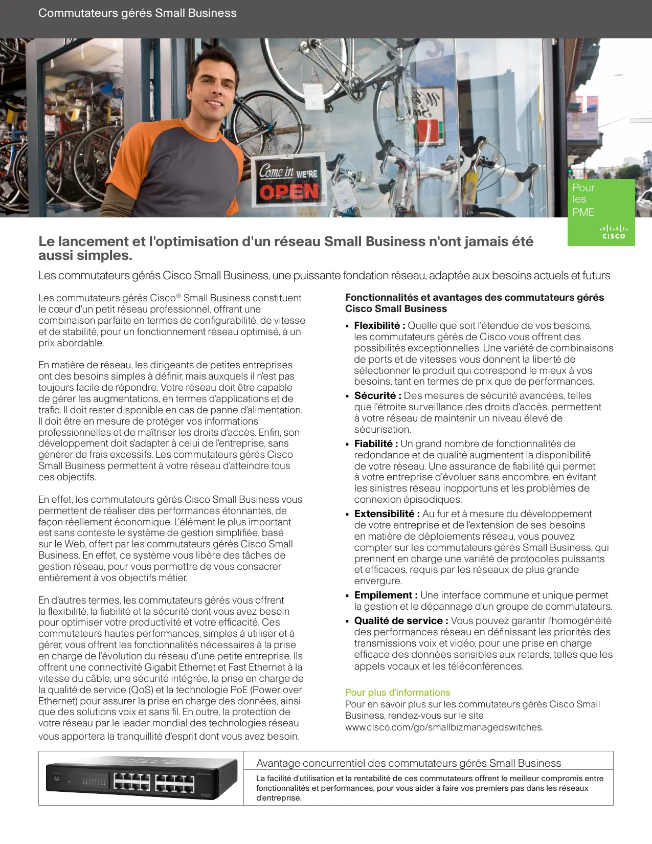 Les commutateurs gérés Cisco® Small Business constituent le cœur d'un petit réseau professionnel, offrant une combinaison parfaite en termes de configurabilité, de vitesse et de stabilité, pour un fonctionnement réseau optimisé, à un prix abordable.