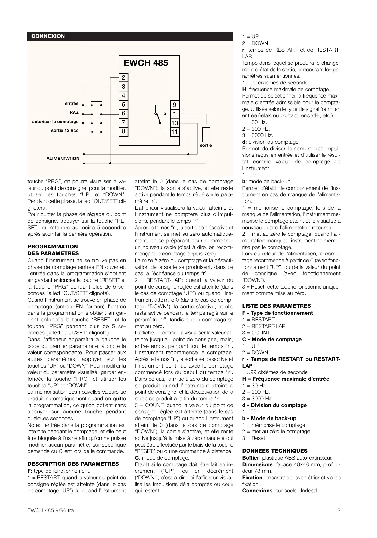Entrées: 3 entrées différentes pour compte, activation du compte et mise à zéro à distance au moyen de contacts secs ou logiques TTL.