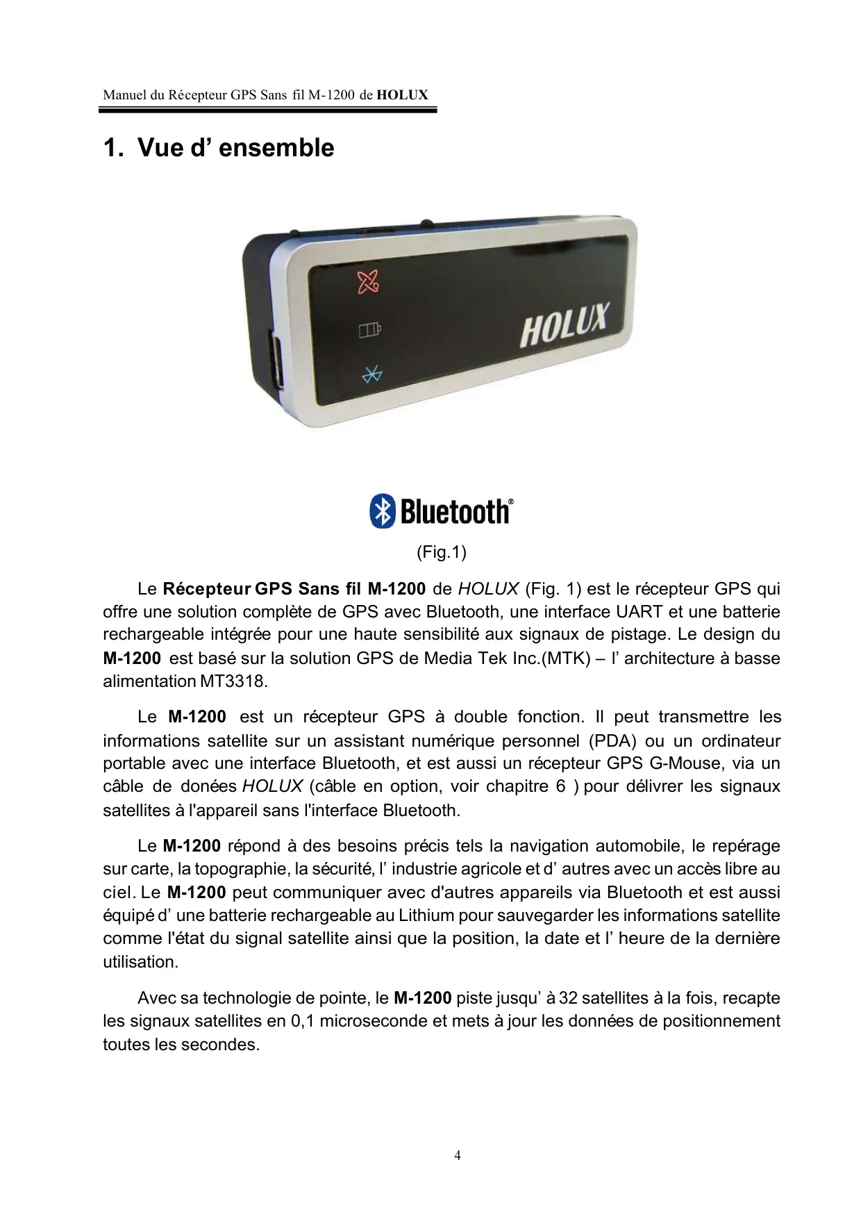 (Fig.1) Le Récepteur GPS Sans fil M-1200 de HOLUX (Fig. 1) est le récepteur GPS qui offre une solution complète de GPS avec Bluetooth, une interface UART et une batterie rechargeable intégrée pour une haute sensibilité aux signaux de pistage. Le design du M-1200 est basé sur la solution GPS de Media Tek Inc.(MTK) – l’architecture à basse alimentation MT3318. Le M-1200 est un récepteur GPS à double fonction. Il peut transmettre les informations satellite sur un assistant numérique personnel (PDA) ou un ordinateur portable avec une interface Bluetooth, et est aussi un récepteur GPS G-Mouse, via un câble de donées HOLUX (câble en option, voir chapitre 6 ) pour délivrer les signaux satellites à l'appareil sans l'interface Bluetooth. Le M-1200 répond à des besoins précis tels la navigation automobile, le repérage sur carte, la topographie, la sécurité, l’industrie agricole et d’autres avec un accès libre au ciel. Le M-1200 peut communiquer avec d'autres appareils via Bluetooth et est aussi équipé d’une batterie rechargeable au Lithium pour sauvegarder les informations satellite comme l'état du signal satellite ainsi que la position, la date et l’heure de la dernière utilisation. Avec sa technologie de pointe, le M-1200 piste jusqu’à 32 satellites à la fois, recapte les signaux satellites en 0,1 microseconde et mets à jour les données de positionnement toutes les secondes.