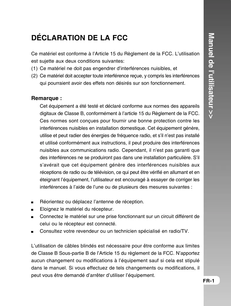 Ce matériel est conforme à l’Article 15 du Règlement de la FCC. L’utilisation est sujette aux deux conditions suivantes: (1) Ce matériel ne doit pas engendrer d’interférences nuisibles, et (2) Ce matériel doit accepter toute interférence reçue, y compris les interférences qui pourraient avoir des effets non désirés sur son fonctionnement. Remarque : Cet équipement a été testé et déclaré conforme aux normes des appareils digitaux de Classe B, conformément à l’article 15 du Règlement de la FCC. Ces normes sont conçues pour fournir une bonne protection contre les interférences nuisibles en installation domestique. Cet équipement génère, utilise et peut radier des énergies de fréquence radio, et s’il n’est pas installé et utilisé conformément aux instructions, il peut produire des interférences nuisibles aux communications radio. Cependant, il n’est pas garanti que des interférences ne se produiront pas dans une installation particulière. S’il s’avérait que cet équipement génère des interférences nuisibles aux réceptions de radio ou de télévision, ce qui peut être vérifié en allumant et en éteignant l’équipement, l’utilisateur est encouragé à essayer de corriger les interférences à l’aide de l’une ou de plusieurs des mesures suivantes : Manuel de l’utilisateur >>