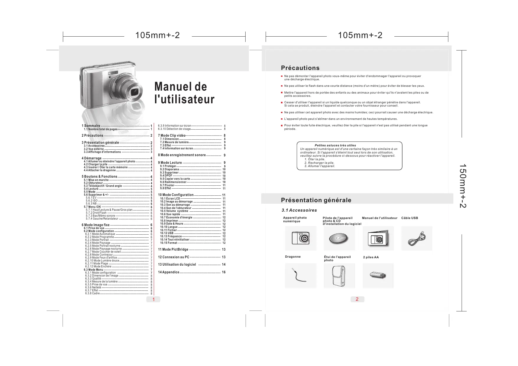 105mm+-2 105mm+-2 Précautions Ne pas démonter l'appareil photo vous-même pour éviter d'endommager l'appareil ou provoquer une décharge électrique. Manuel de l'utilisateur Ne pas utiliser le flash dans une courte distance (moins d'un mètre) pour éviter de blesser les yeux. Mettre l'appareil hors de portée des enfants ou des animaux pour éviter qu'ils n'avalent les piles ou de petits accessoires. Cesser d'utiliser l'appareil si un liquide quelconque ou un objet étranger pénètre dans l'appareil. Si cela se produit, éteindre l'appareil et contacter votre fournisseur pour conseil. Ne pas utiliser cet appareil photo avec des mains humides; ceci pourrait causer une décharge électrique. L'appareil photo peut s'abîmer dans un environnement de hautes températures. 1 Sommaire
