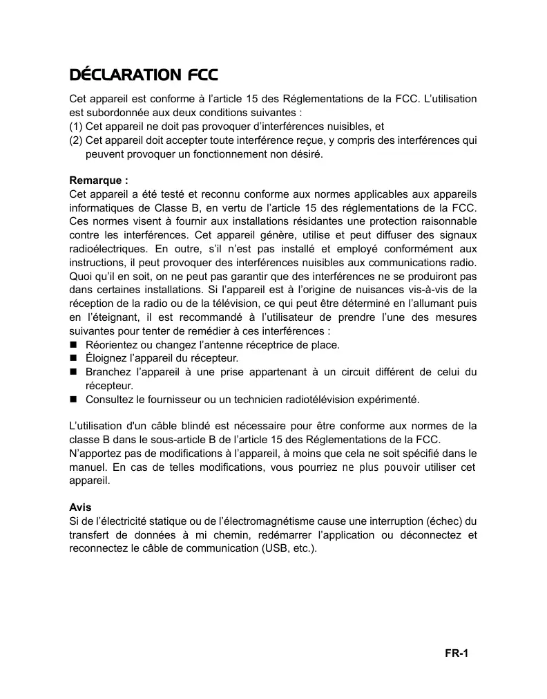 Cet appareil est conforme à l’article 15 des Réglementations de la FCC. L’utilisation est subordonnée aux deux conditions suivantes : (1) Cet appareil ne doit pas provoquer d’interférences nuisibles, et (2) Cet appareil doit accepter toute interférence reçue, y compris des interférences qui peuvent provoquer un fonctionnement non désiré. Remarque : Cet appareil a été testé et reconnu conforme aux normes applicables aux appareils informatiques de Classe B, en vertu de l’article 15 des réglementations de la FCC. Ces normes visent à fournir aux installations résidantes une protection raisonnable contre les interférences. Cet appareil génère, utilise et peut diffuser des signaux radioélectriques. En outre, s’il n’est pas installé et employé conformément aux instructions, il peut provoquer des interférences nuisibles aux communications radio. Quoi qu’il en soit, on ne peut pas garantir que des interférences ne se produiront pas dans certaines installations. Si l’appareil est à l’origine de nuisances vis-à-vis de la réception de la radio ou de la télévision, ce qui peut être déterminé en l’allumant puis en l’éteignant, il est recommandé à l’utilisateur de prendre l’une des mesures suivantes pour tenter de remédier à ces interférences : Réorientez ou changez l’antenne réceptrice de place. Éloignez l’appareil du récepteur. Branchez l’appareil à une prise appartenant à un circuit différent de celui du récepteur. Consultez le fournisseur ou un technicien radiotélévision expérimenté. L’utilisation d'un câble blindé est nécessaire pour être conforme aux normes de la classe B dans le sous-article B de l’article 15 des Réglementations de la FCC. N’apportez pas de modifications à l’appareil, à moins que cela ne soit spécifié dans le manuel. En cas de telles modifications, vous pourriez ne plus pouvoir utiliser cet appareil. Avis Si de l’électricité statique ou de l’électromagnétisme cause une interruption (échec) du transfert de données à mi chemin, redémarrer l’application ou déconnectez et reconnectez le câble de communication (USB, etc.). FR-1
