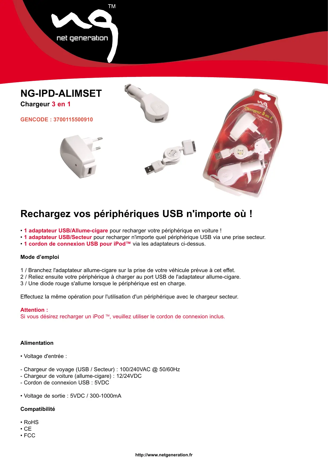 NG-IPD-ALIMSET - Chargeur USB NET GENERATION - Notice d'utilisation et mode d'emploi gratuit