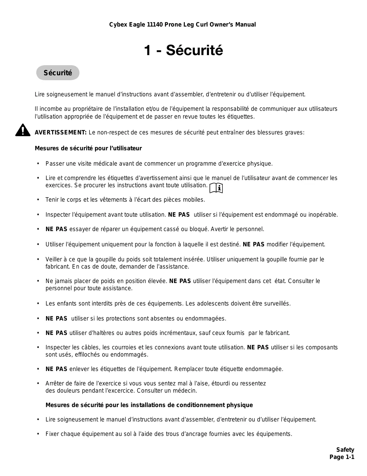 Il incorme à l'acheteur/utilisateur des produits Cybex de litre et de comprendre le contenu du guide du propriétaire, ainsi que les étiquettes d'avertissement, et de former tant les utilisateurs finals que le personnel de supervision à l'utilisation appropriée de l'équipement.