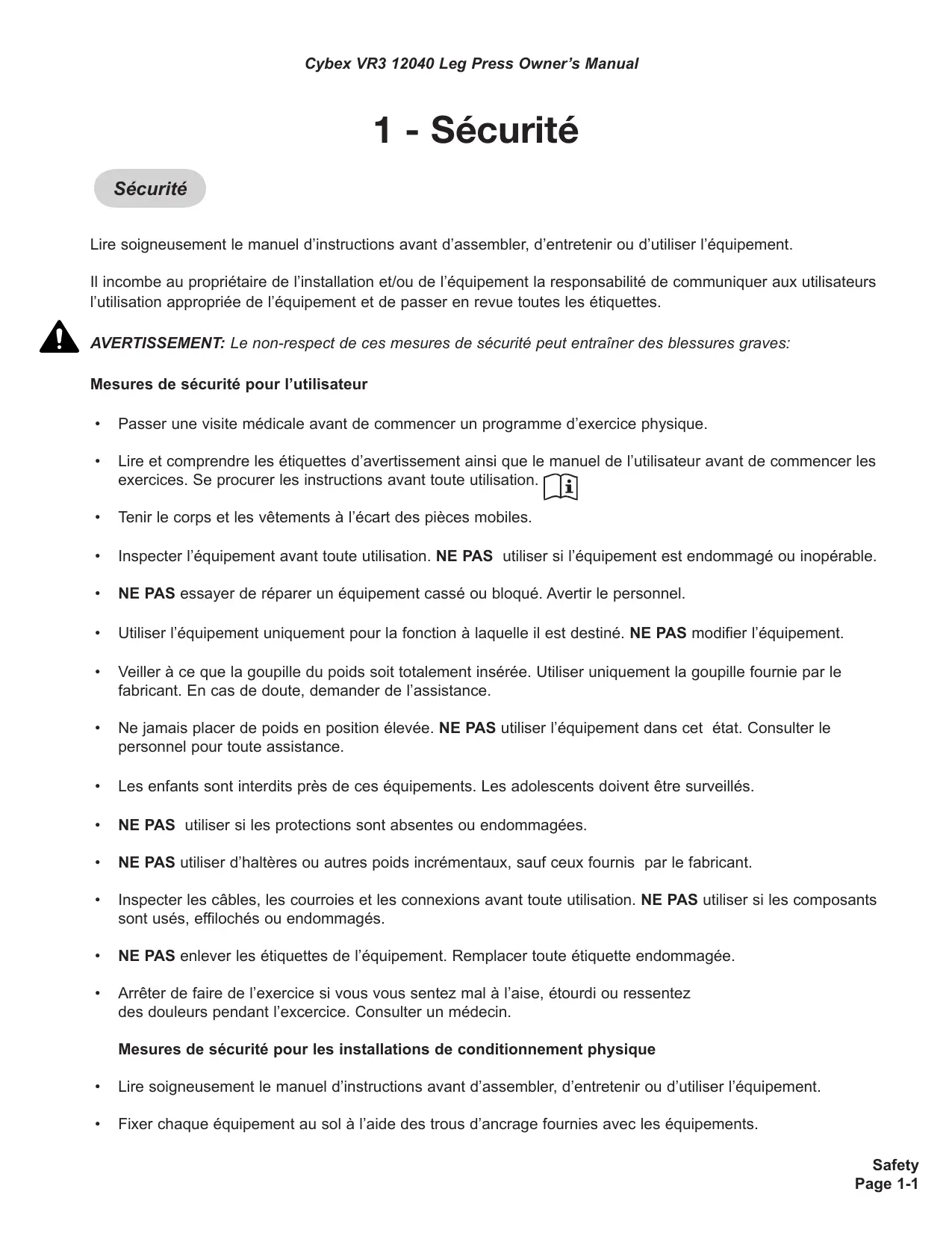 - Cybex VR3® Leg Press Owner’s Manual Systèmes pour la force Réf. 12040-999-2 J www.cybexinternational.com Cybex VR3® Leg Press Owner’s Manual Systèmes pour la force Réf. 12040-999-2 J Cybex®et le logo Cybex® sont des marques déposées de Cybex International, Inc. VR3®et le logo sont des marques déposées de Cybex International, Inc. CLAUSE DE NON-RESPONSABILITE : Cybex International, Inc. ne fait aucune déclaration et n’offre aucune garantie quant au contenu de ce manuel. Nous nous réservons le droit de réviser ce document à tout moment et de faire des modifications du produit décrit dans ce document, sans préavis ni obligation d’avertir quiconque de telles révisions ou modifications. © Copyright 2010 Cybex International, Inc. Tous droits réservés. Imprimé aux États-Unis d’Amérique. 10 Trotter Drive Medway, MA 02053 U.S.A • +1 (508) 533-4300 • FAX +1 (508) 533-5183 www.cybexinternational.com • techhelp@cybexintl.com • 12040-999-2 J Table des matières 1 Sécurité Sécurité Consignes et pratiques de sécurité Autocollants avertissement/mise en garde Activités régulières de maintenance