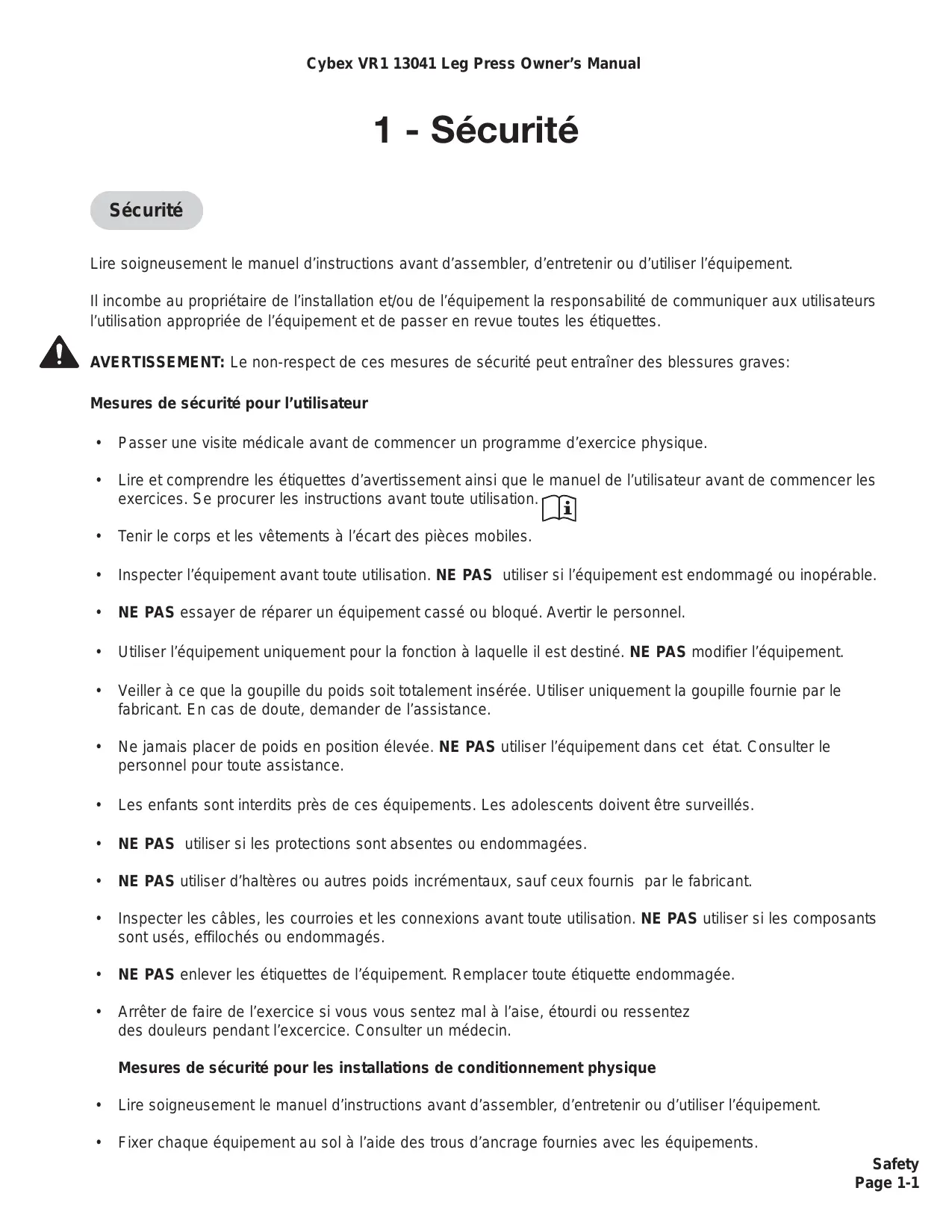Il incombe à l'acheteur/utilisateur des produits Cybex de litre et de comprendre le contenu du guide du propriétaire, ainsi que les étiquettes d'avertissement, et de former tant les utilisateurs finals que le personnel de supervision à l'utilisation appropriée de l'équipement.