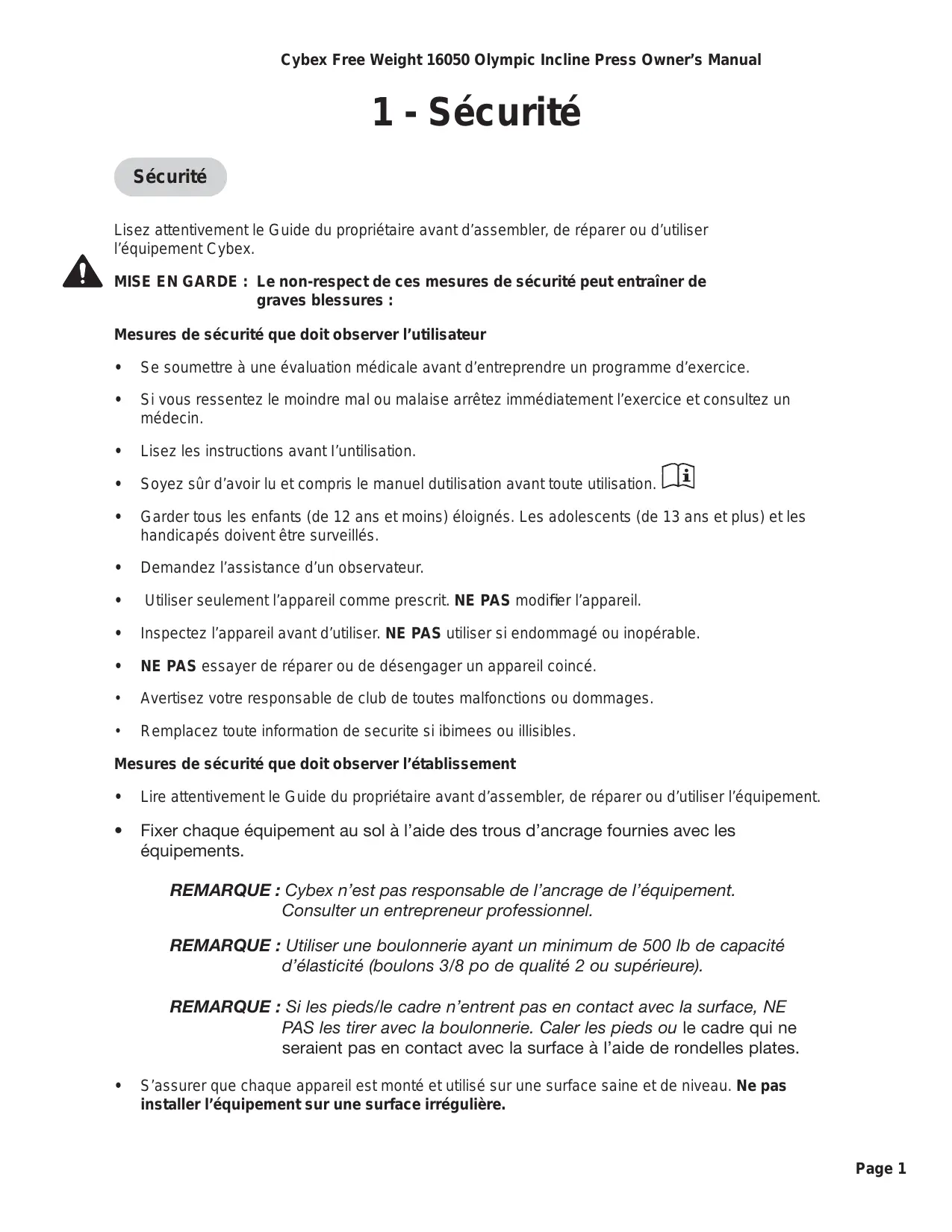 Lisez attentivement le Guide du propriétaire avant d'assembler, de réparer ou d'utiliser l'équipement Cybex.
