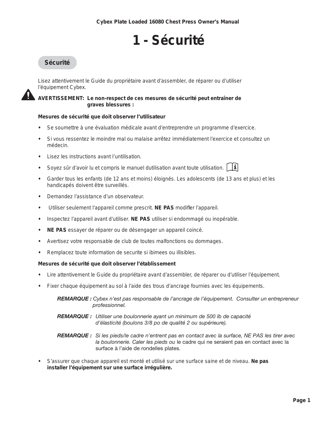Lisez attentivement le Guide du propriétaire avant d'assembler, de réparer ou d'utiliser l'équipement Cybex.